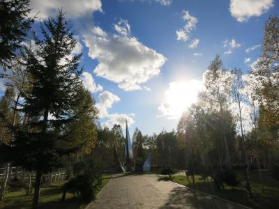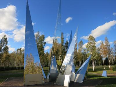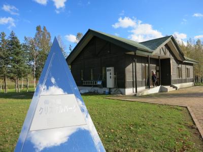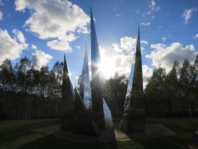 日本最寒-41.2℃を記念したモニュメント、クリスタルピークスが建っています。木々の葉の彩りも鮮やかさを増す10月に行きました。秋の日を受け輝くモニュメントは、周囲の白樺林を映して冷涼な空気の中、誰もいない公園に静かに佇んでいました。