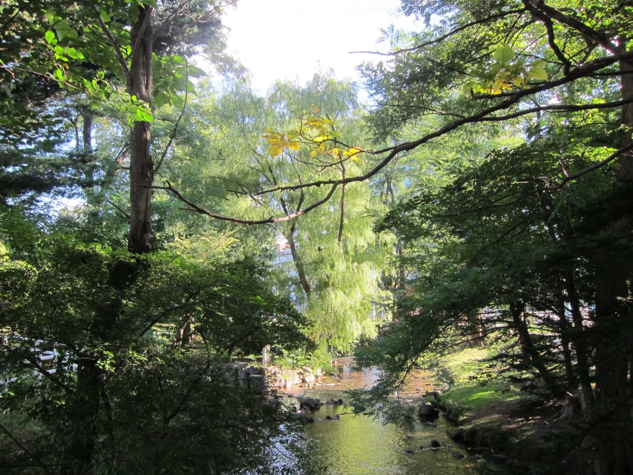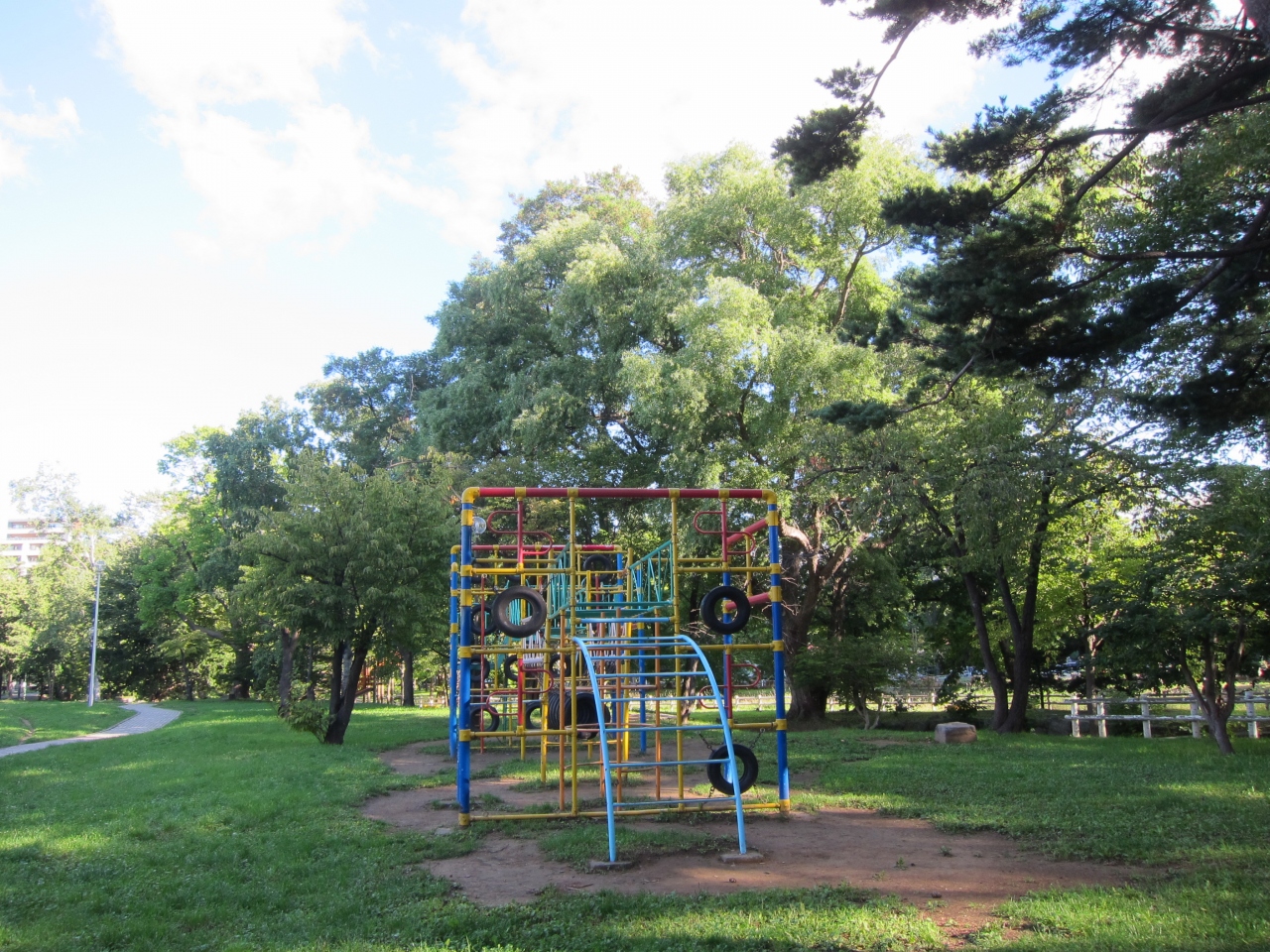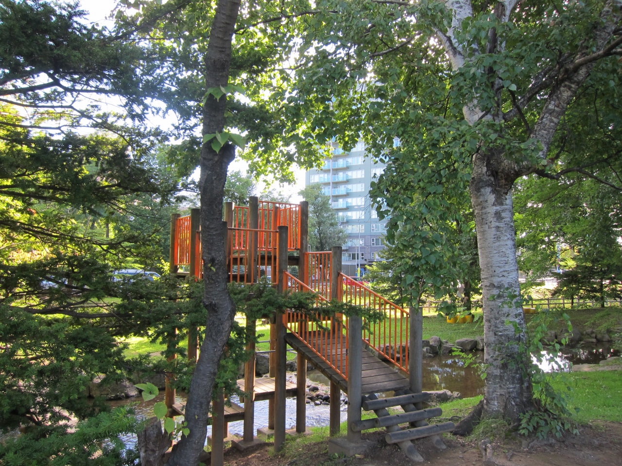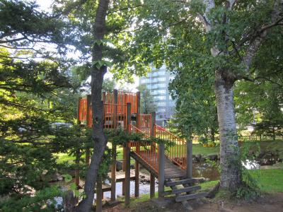 地下鉄南北線、幌平橋駅の出口近くの鴨々川は水遊び場となっています。ひざ下ほどの浅いせせらぎで、川床も砂利が敷かれています。この付近と、南14条橋の北側あたり(水辺の階段)にかけては、水面まで下りて遊べるようになっています。ただ、庭園木が生えていて、水辺の階段の方がさっぱりしていて良いような気がします。アクセスは地下鉄出口すぐなので抜群です。1975年に整備されたそうですが、当時は川面にもいろいろ遊具があったようです。今では徐々に撤去され、オレンジ色の物見台が辛うじて残っています。