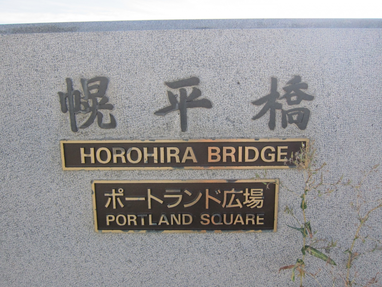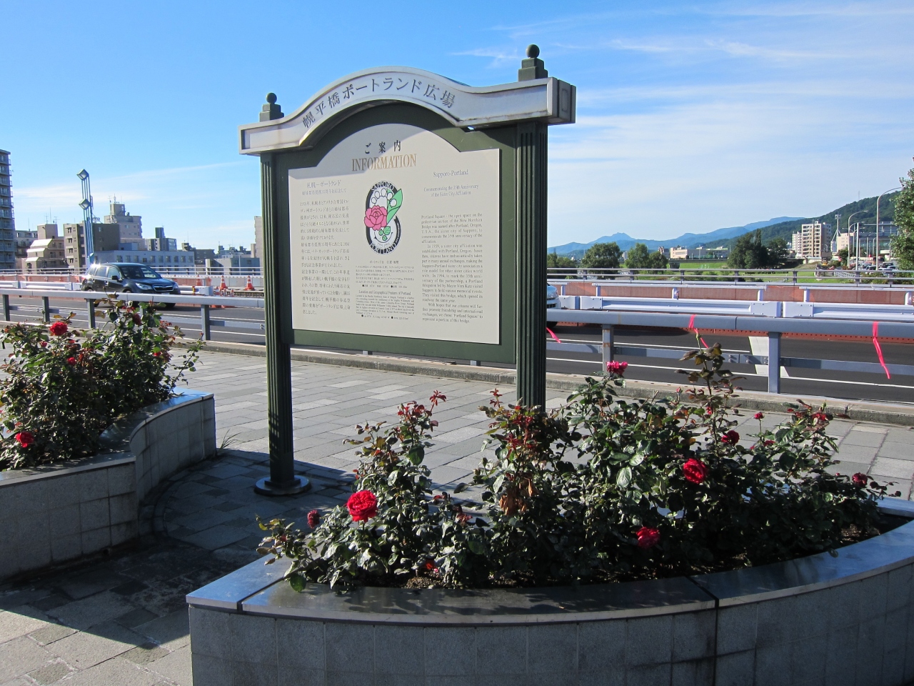 橋は広く、片側2車線の車道のほか、橋上橋のある庭園道路(歩道)が整備され、幌平橋ポートランド広場の名が付けられています。札幌市の姉妹都市、ポートランド市の紹介や幌平橋の歴史などの解説板があります。