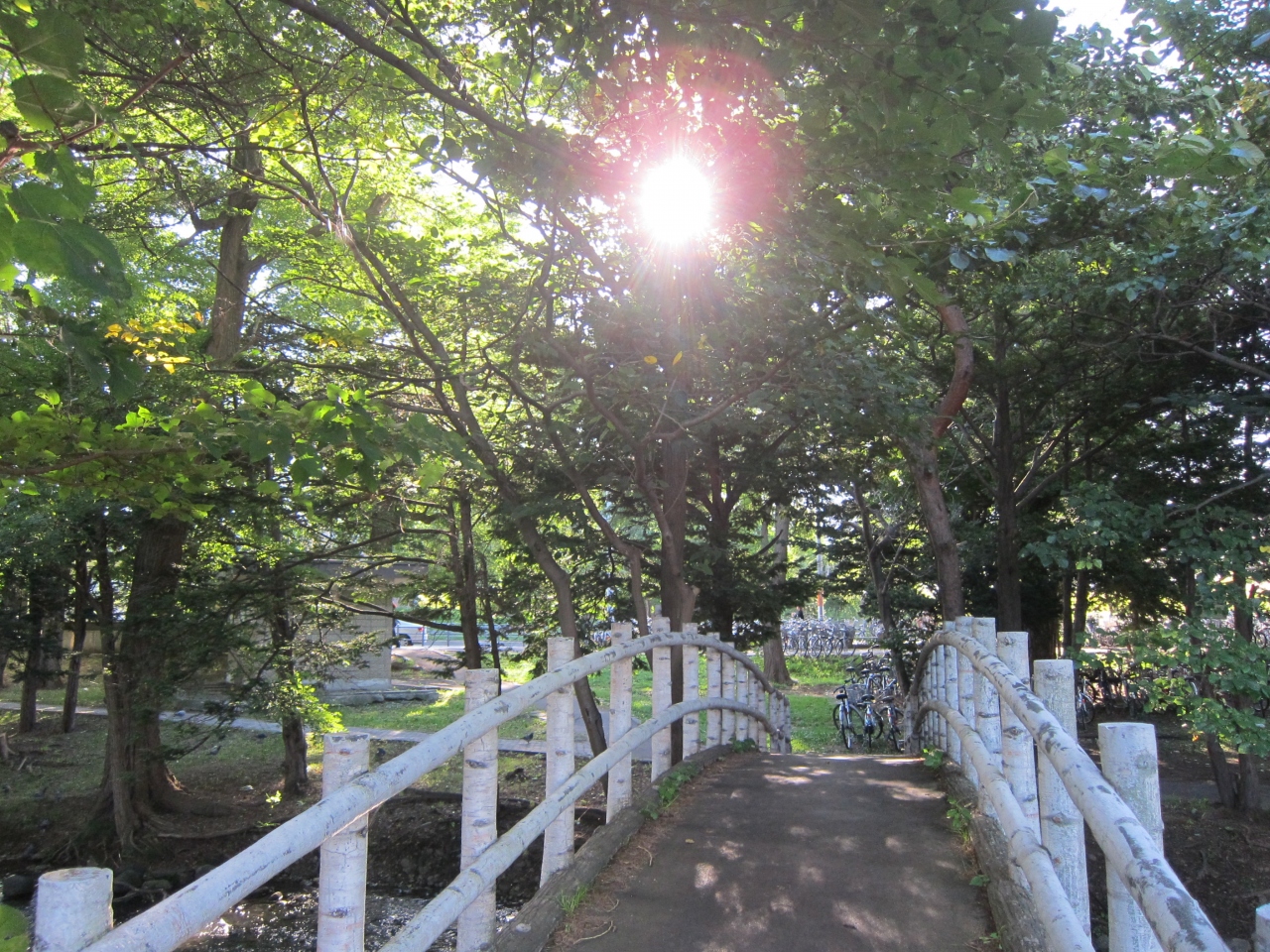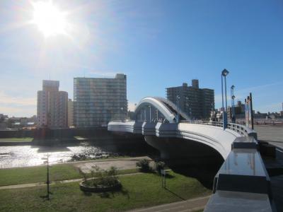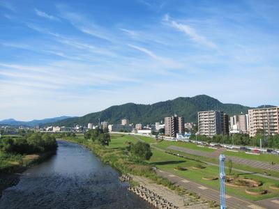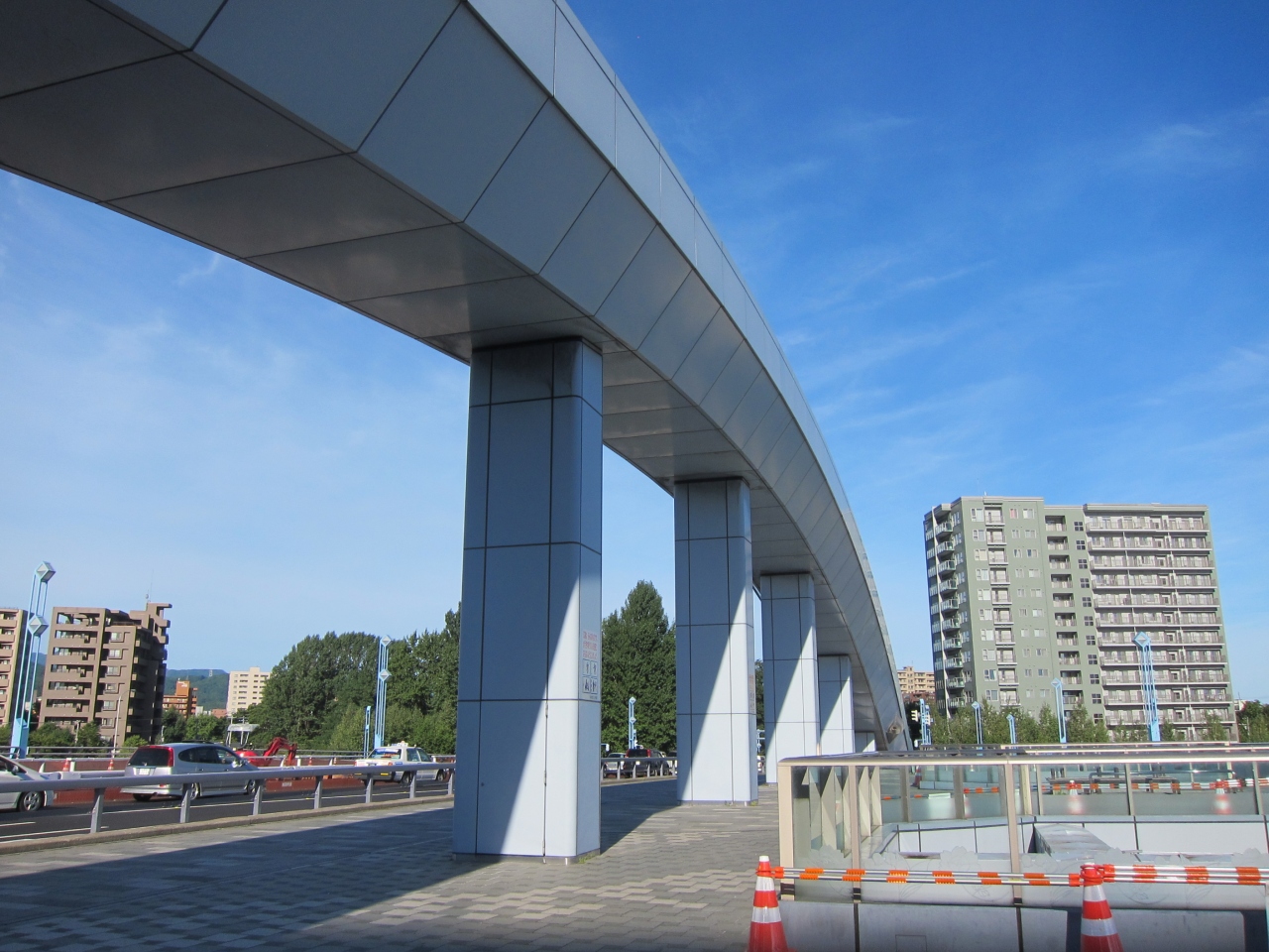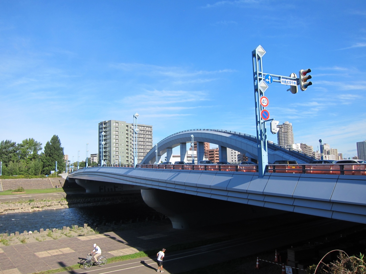 南14条あたりで豊平川に架かる橋。橋の上に橋が架かっています。橋上橋からは見晴らしがよく、目の前の藻岩山や特異な形をした恵庭岳、そしてよく晴れた日は街並みの向こうに樺戸・暑寒の山並みが見えます。階段を上るので雪が積もる真冬や、花火大会の日は閉鎖です。
