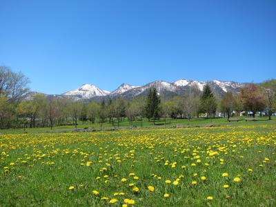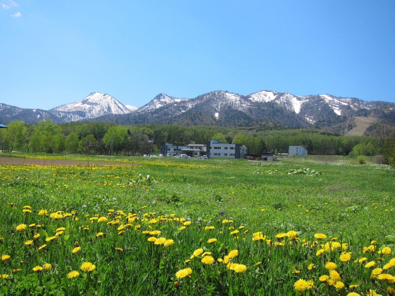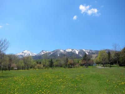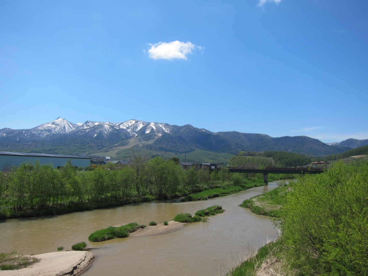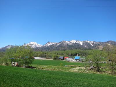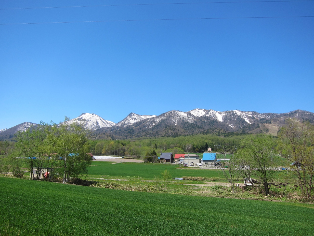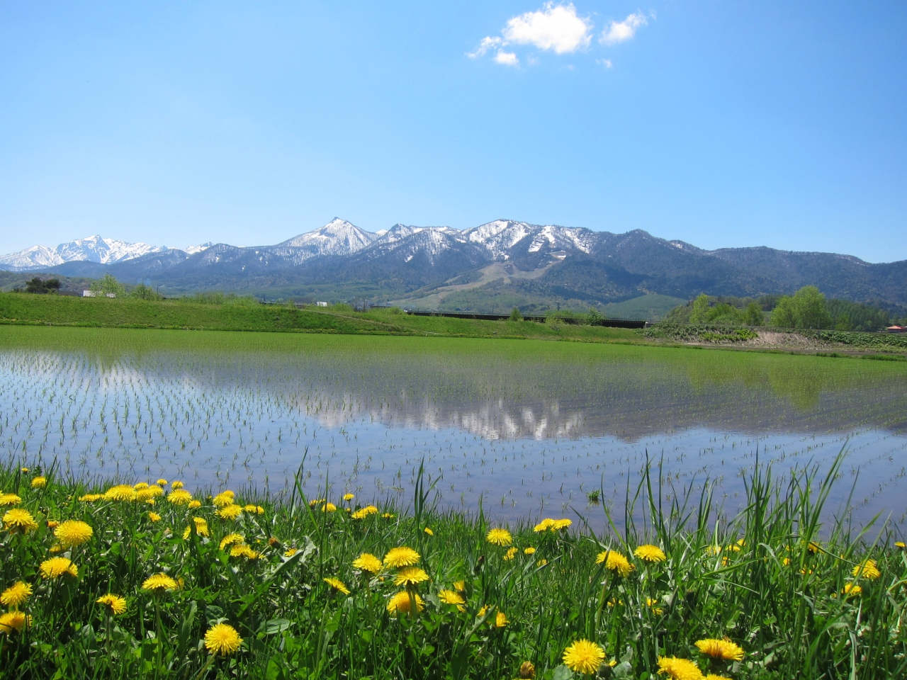 5月の終わりに富良野駅で降りて、近くを散歩しながらゆっくり眺めてみました。上部に雪をかぶる山容を水の張られた水田に映し、薫風そよぐ中、しばらく旅人の足をとめて離しませんでした。