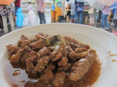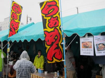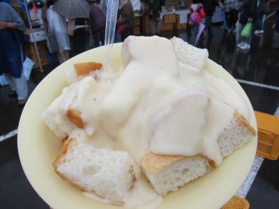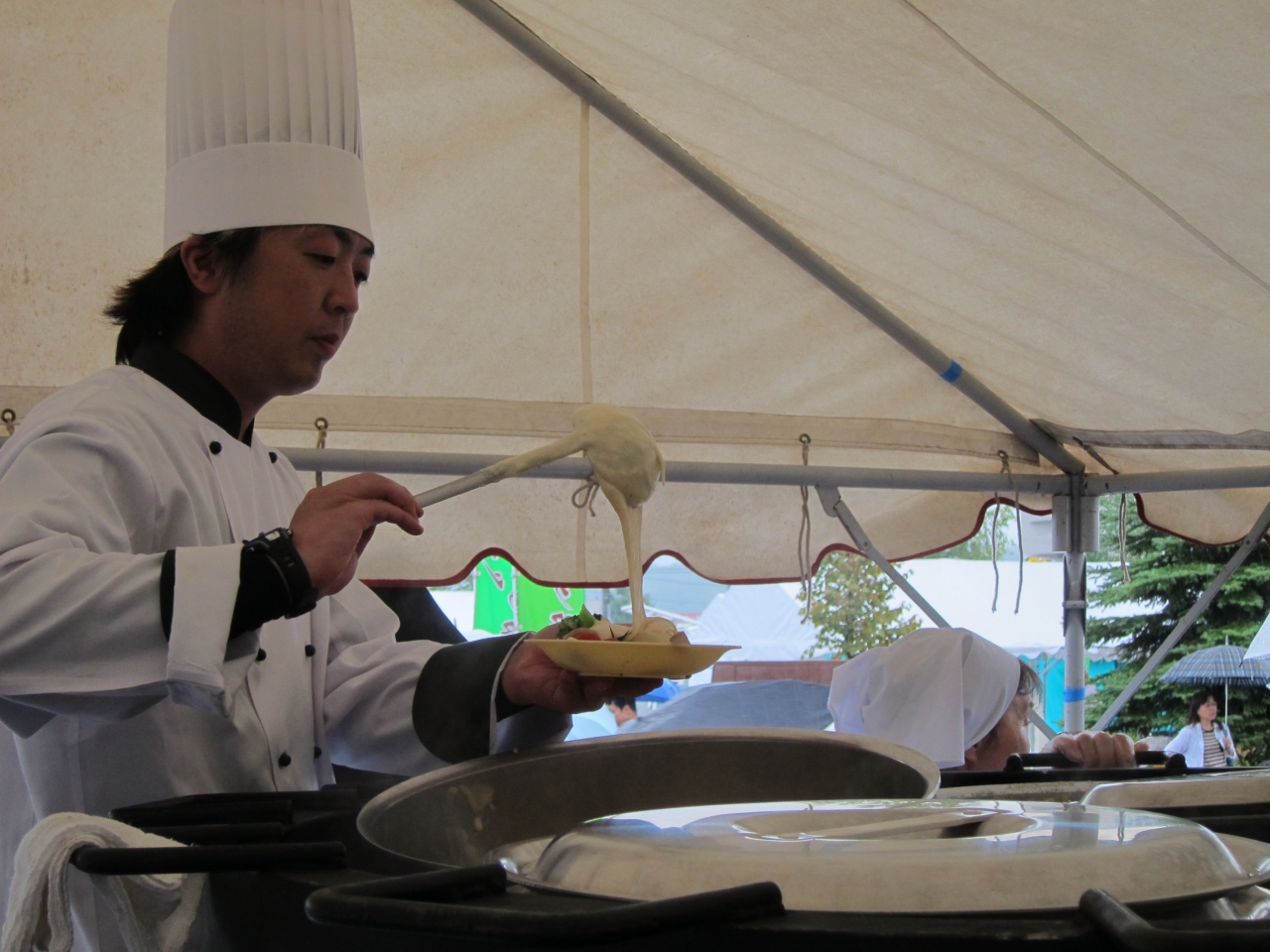 会場は露店が10数軒ほど出店していて、パエリアや鹿肉ジンギスカン、そしてワインの祭りならではですが、ちょっと気が引けるふらのワインチーズラーメンというものがありました。でも折角来たのですから、まずおいしそうなものから挑戦。祭りの名物の一つ、ふらの風チーズフォンデュから試してみました。パン(\500円)か野菜(\600円)を選択し、大釜からたっぷり、とろりとチーズをかけてもらいました。気前のいいおじさんがパンを増量サービスです。温かくてとても美味しかったです。