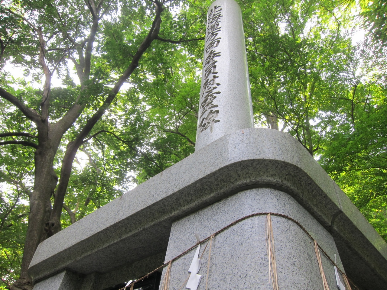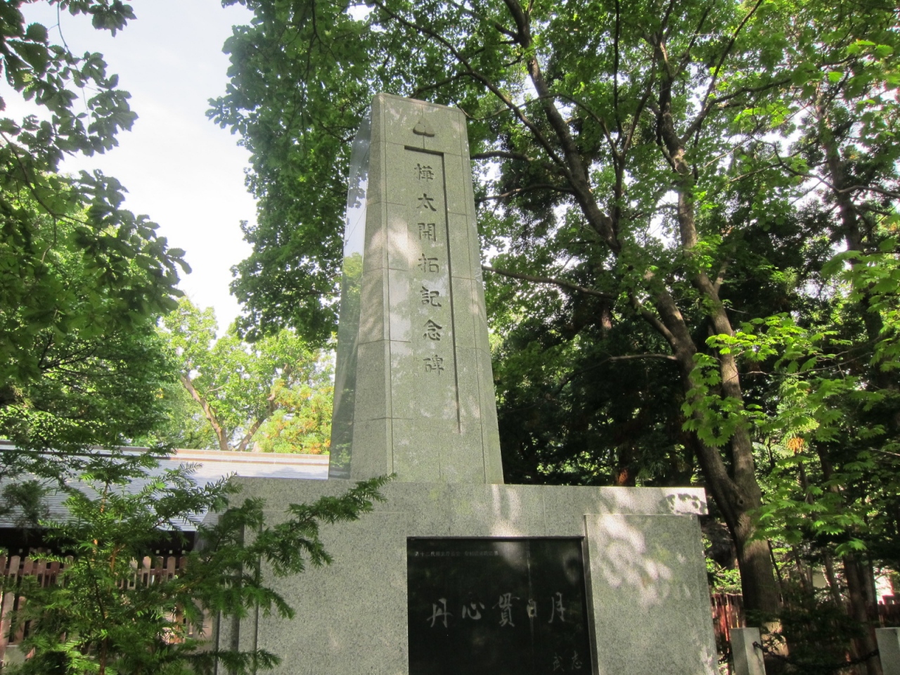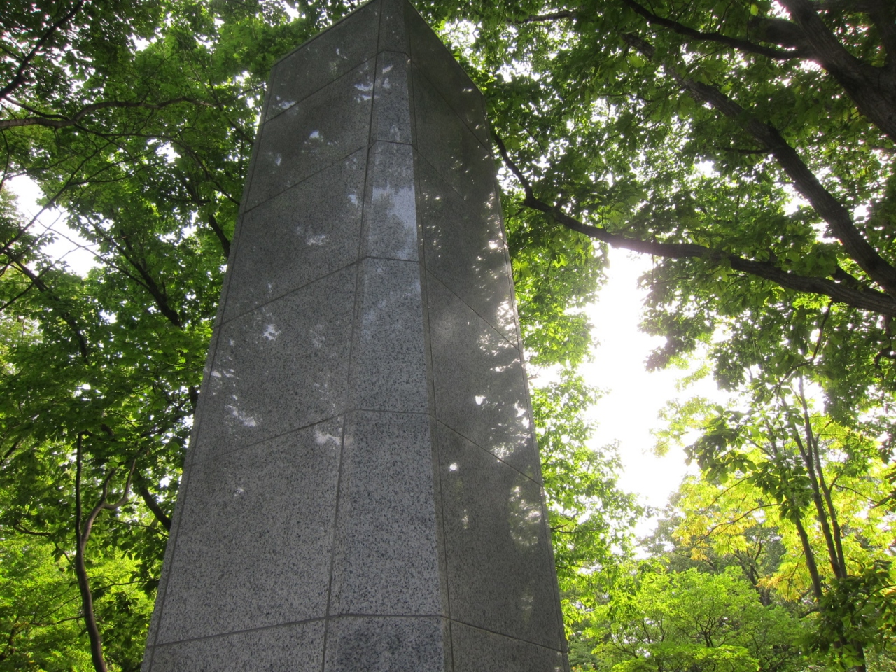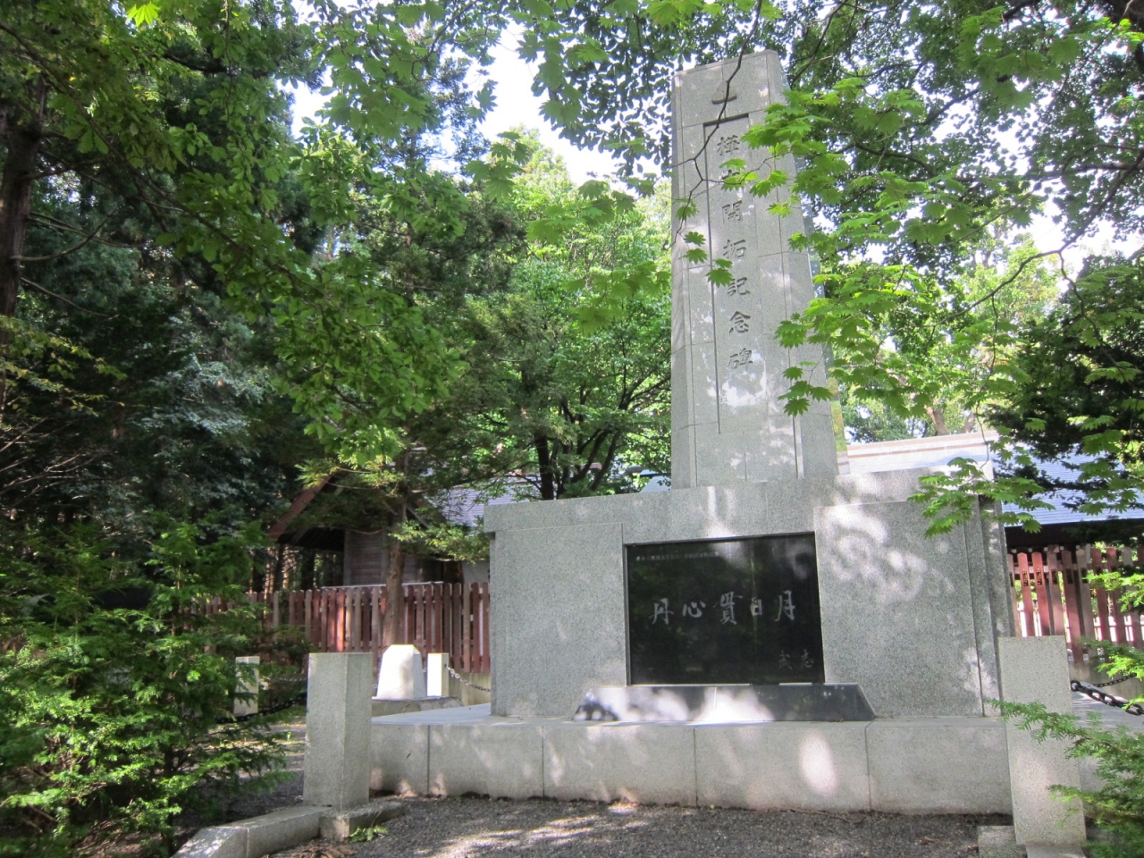 円山公園の南1条通り(裏参道)沿いにあります。明治二年に札幌の町割りをここ円山から眺めて計画した島義勇を顕彰する碑です。高さ8mあまりと、細長くて背が高いですが、木々に囲まれていて意外と目立ちません。文字も高いところから刻まれている上、題字が旧字体なので、島義勇の顕彰碑とは分かりにくいです。
