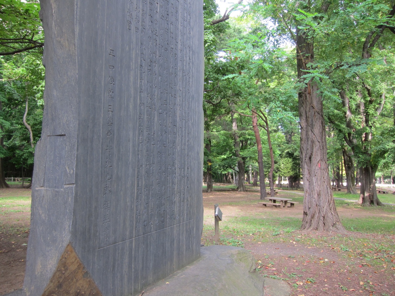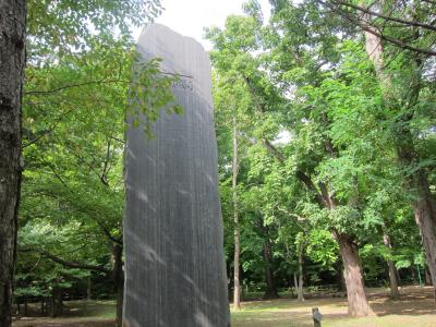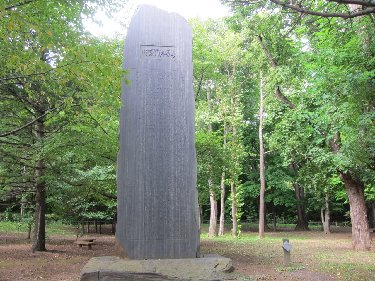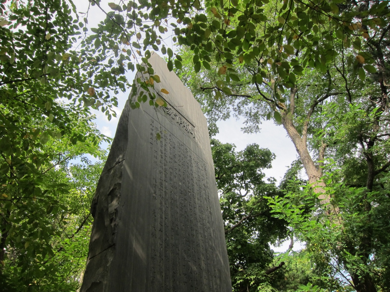 円山公園の南1条通り(裏参道)沿いにあります。明治二年に札幌の町割りをここ円山から眺めて計画した島義勇を顕彰する碑です。高さ8mあまりと、細長くて背が高いですが、木々に囲まれていて意外と目立ちません。文字も高いところから刻まれている上、題字が旧字体なので、島義勇の顕彰碑とは分かりにくいです。
