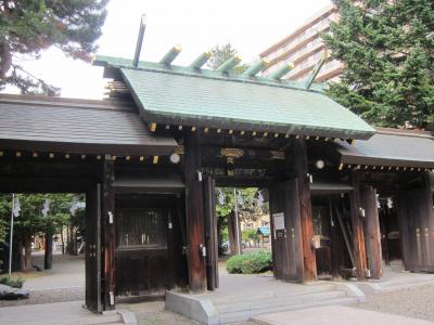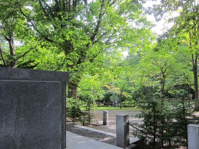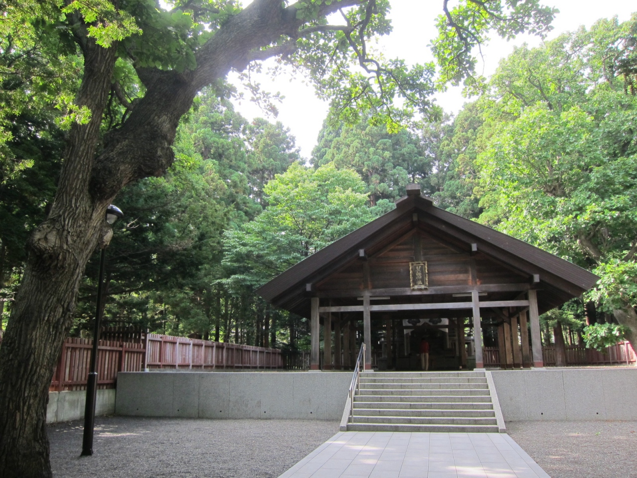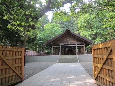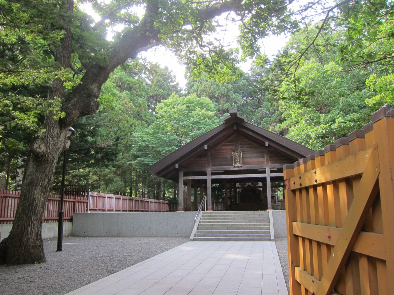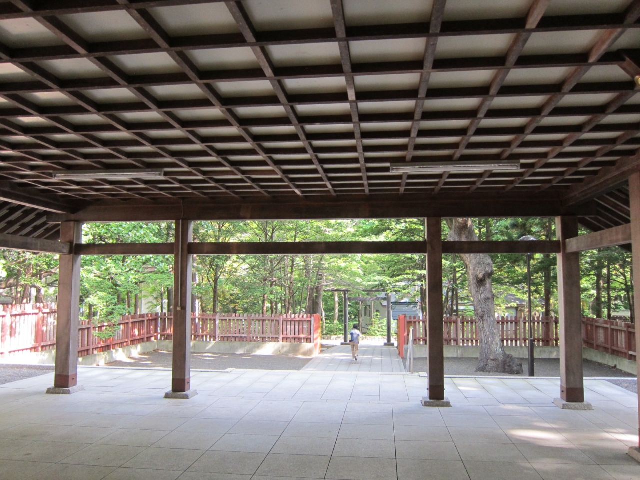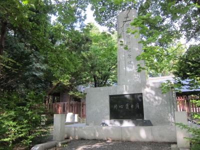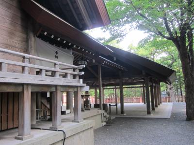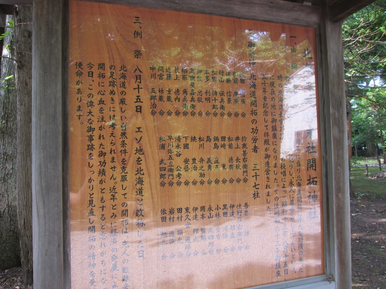 北海道神宮の境内社で、円山公園から境内に入る公園口の参道のところにあります。入口の由緒を見ると、御祭神のところに伊能忠敬や間宮林蔵というよく知る名前が載っています。武田信廣など室町時代に松前を支配した人物の名も載っていました。それぞれ北海道を開拓した名のある人達ばかりです。北海道開拓70年を記念して昭和13年(1938年)に建立され、三十六柱(後年、一柱を追加)の人物を祀ったそうです。神社はそれほど広い訳ではありませんが、柵で囲われたその空間は、整然と、そして静粛な感じで、気も引き締まる心地です。丹などの塗装のない白木の拝殿は北海道らしい造りの感じがしました。