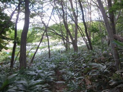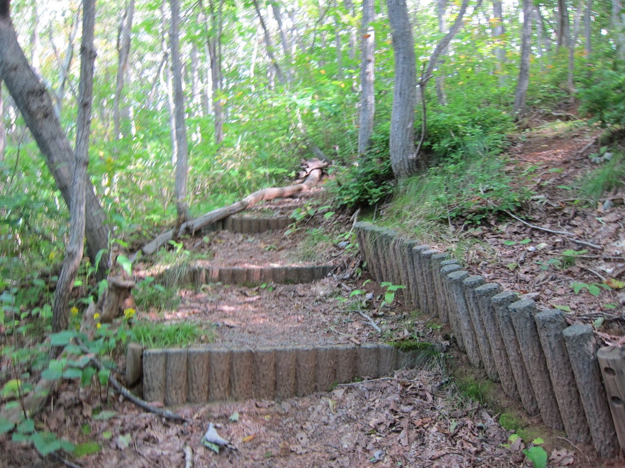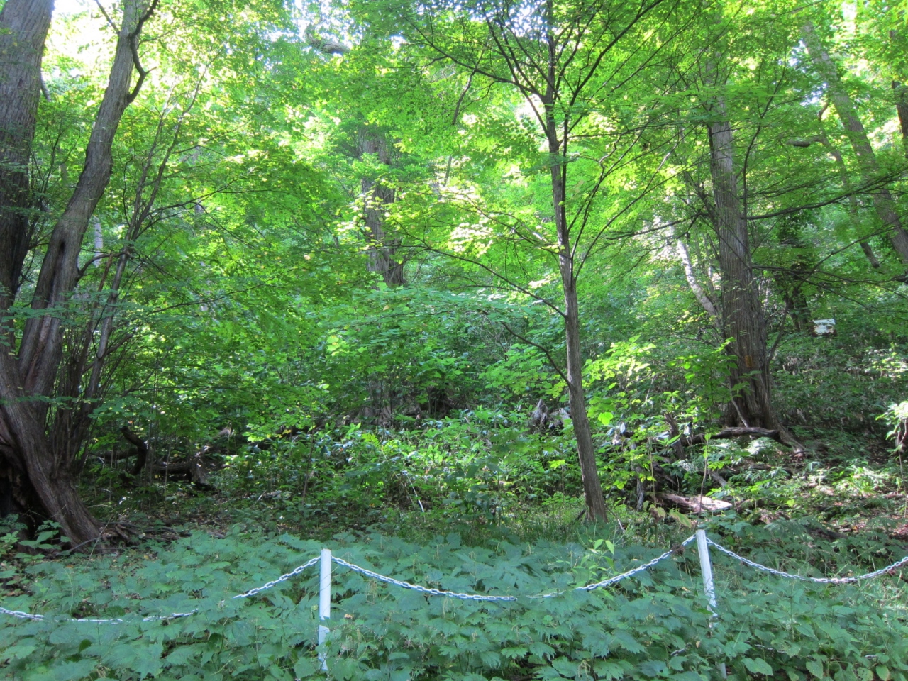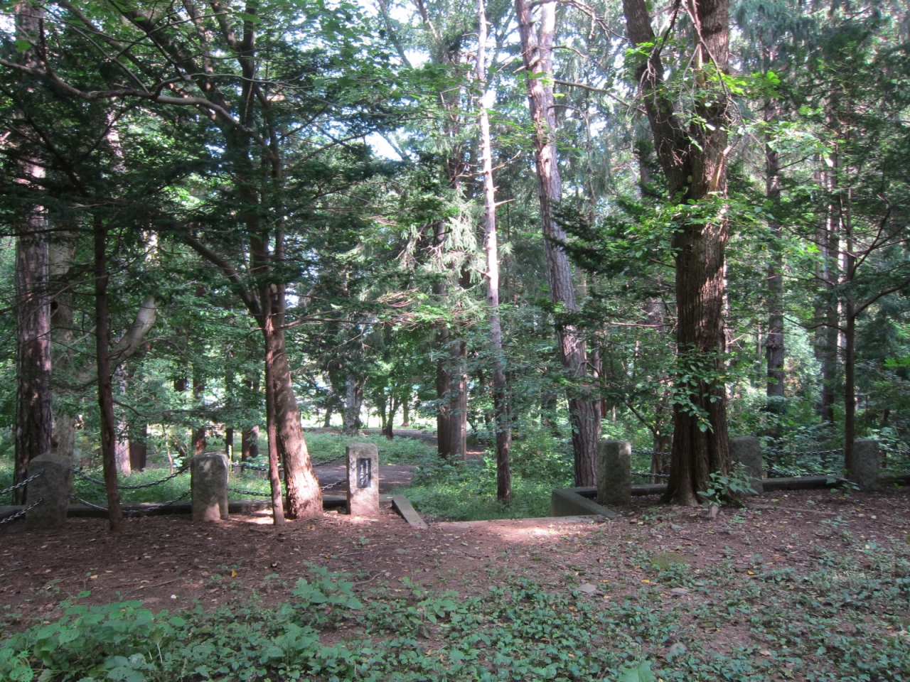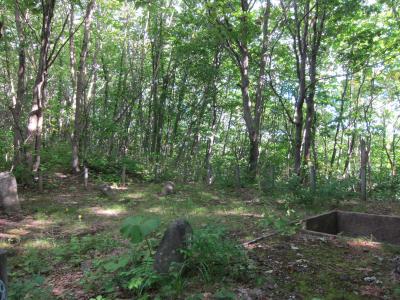 なんかとても怖い感じですが、そのような事は全くありませんでした。近くに丘を越える電柱と整備路みたいな跡があり、列石も何かその礎石だったり、もしくは普通に登山道に転がっている石のようであったり、そして溝も整備ための穴のような感じで、墓らしさが感じられなかったのです(勿論、晴れていて林床も明るかったり、近くには畑や農家があり、JR函館本線の列車の音が聞こえてきたりしたのもあるかもしれません)。