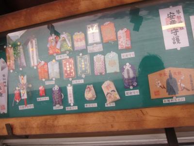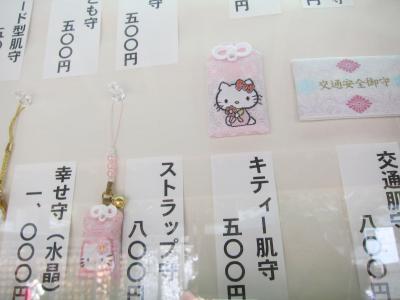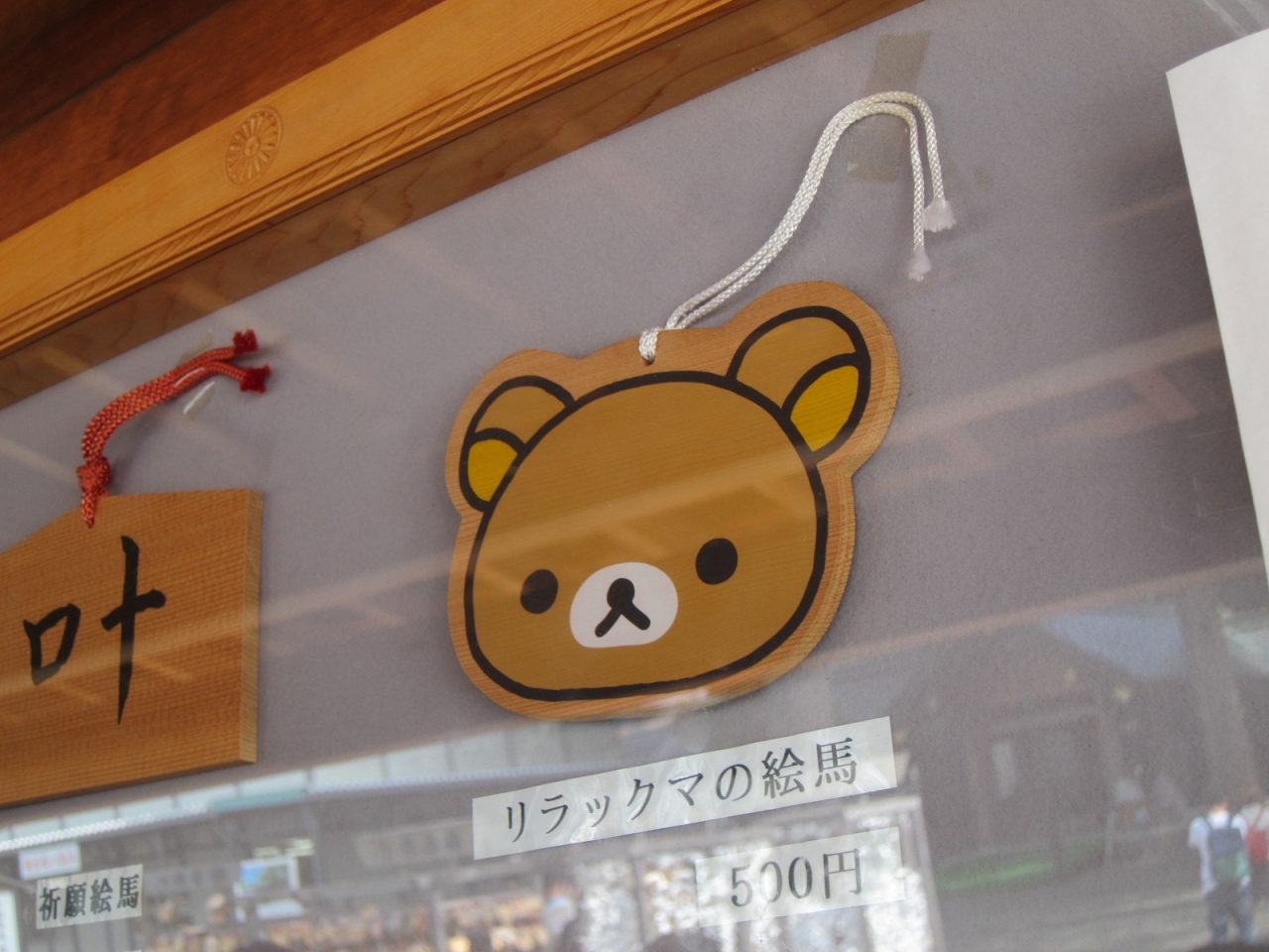 本殿の授与場では、リラックマの絵馬やハローキティのお守りなども販売されていました。それぞれ販売しているものについて、英語、中国語の掲示もありました。