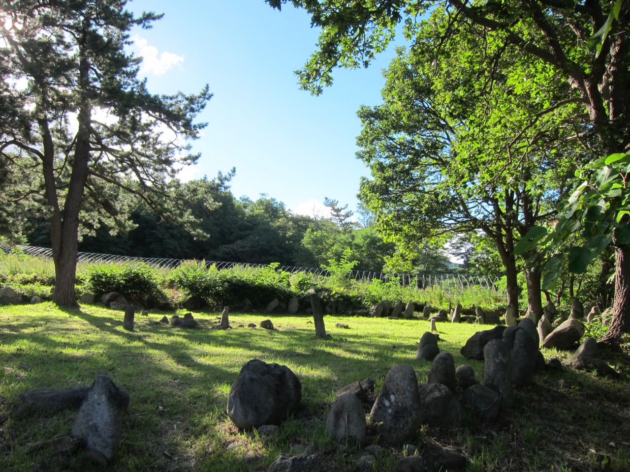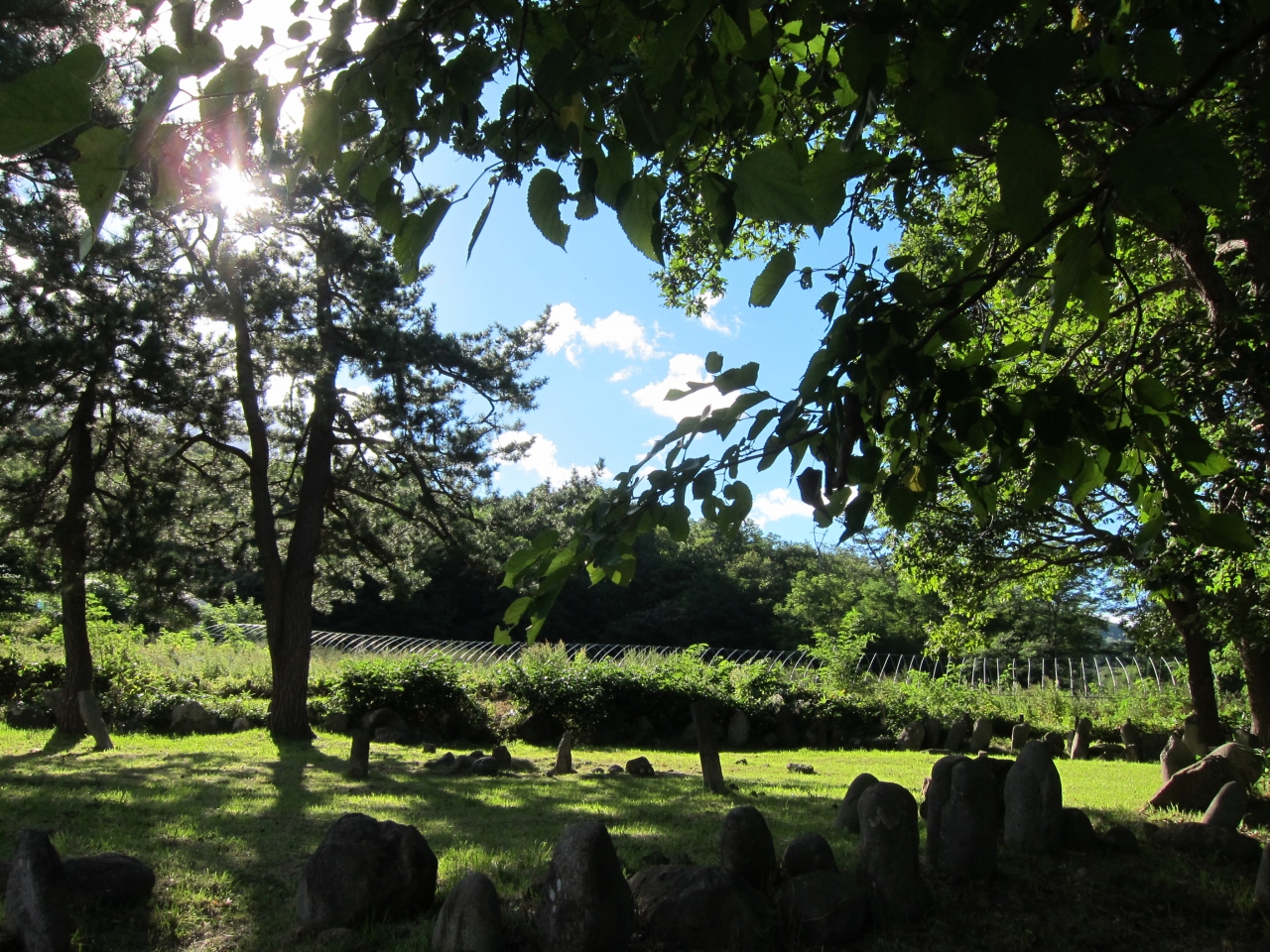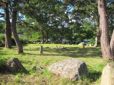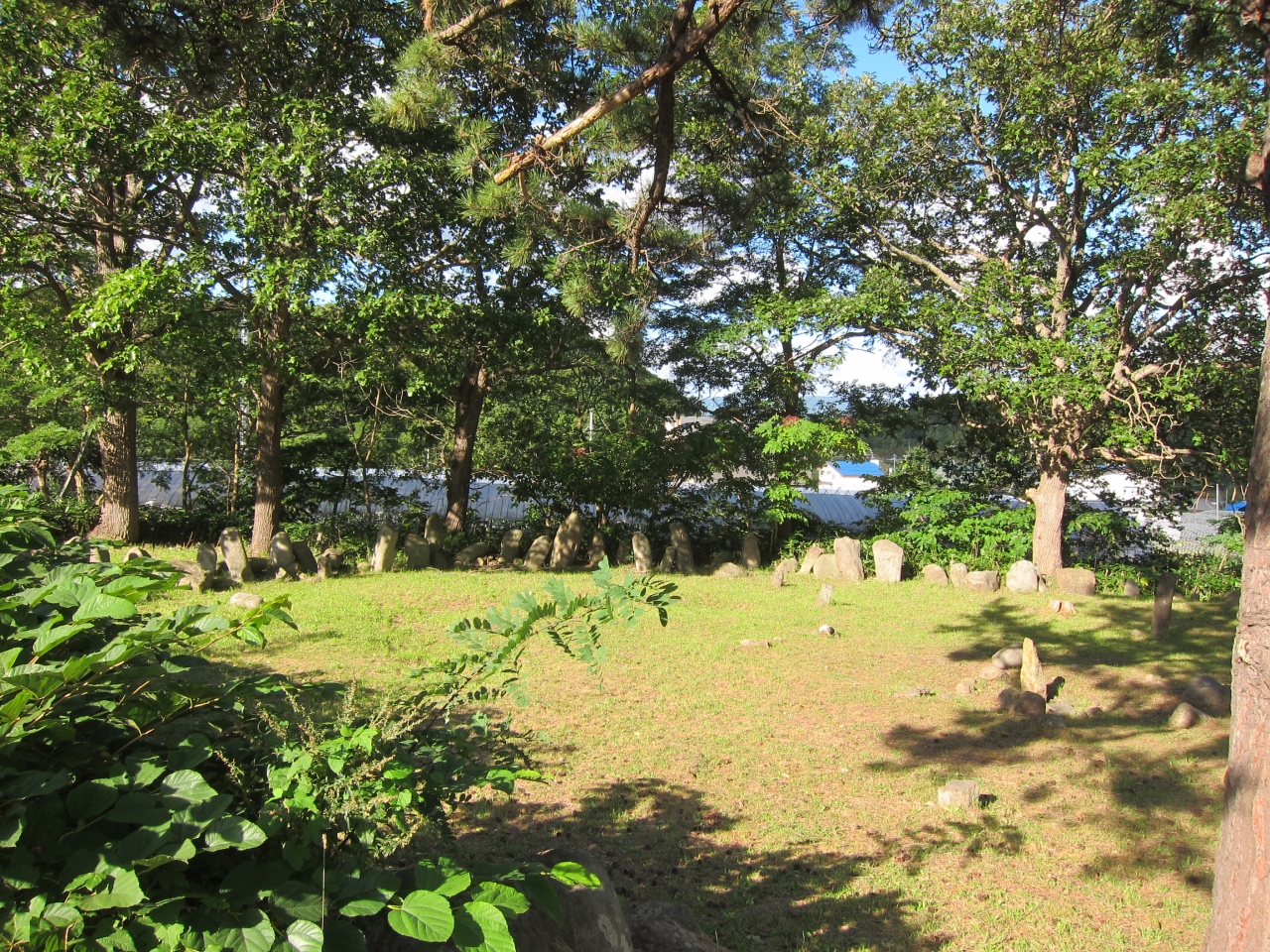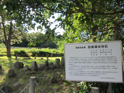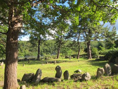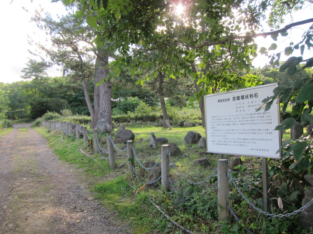 農地の一角にあります。案内柱が立っていなければ分かりません。観光地として整備されている訳ではないため、駐車場もありませんし、環状列石までの道が幅、2mほどの非舗装の農道です。ストーンサークルの響きはいいですが、実際に見てみるとイギリスにあるようなものと異なり、素朴な感じです。1m弱の丸みを帯びた細長い石が、半ば倒れかかった感じで歪んだ円形に並び、中央部に墓跡のような細長く少し角ばった感じの石が数基、点在しています。雑草が刈り取られ、看板もあるため遺構だと分かりますが、これが草に埋もれていたりしたら、農家の資材置き場の石積と間違えられそうです。周辺には他にも環状列石がありますが、ここにあるものはその中でも規模が一番大きいです。3,500年前の縄文時代後期に作られたものだそうです。