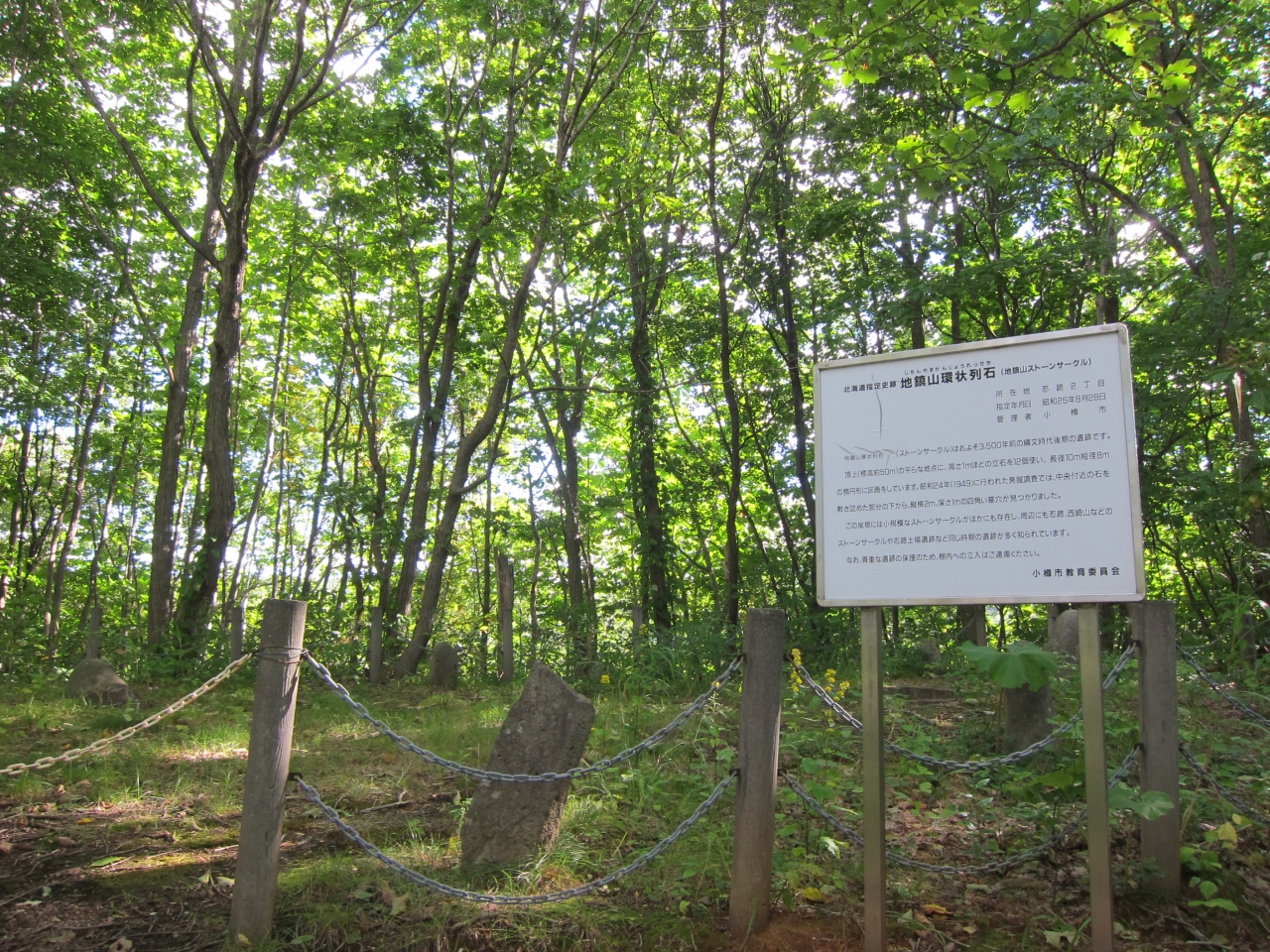 JR蘭島駅から東へ1kmほどのところ。函館本線の南側に、国道5号線のバイパス的な、塩谷~余市・仁木を結ぶ道路がありますが、その蘭島川と交差するあたりに案内板が立っています。列石はそこから非舗装の側道に入り、更に登山道のような山道(階段が整備されている)を、熊笹をかき分けて10~20mほど登った丘の上にあります。