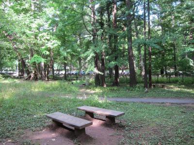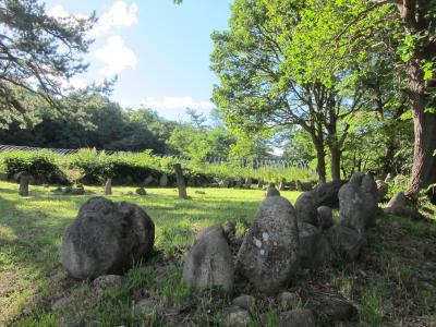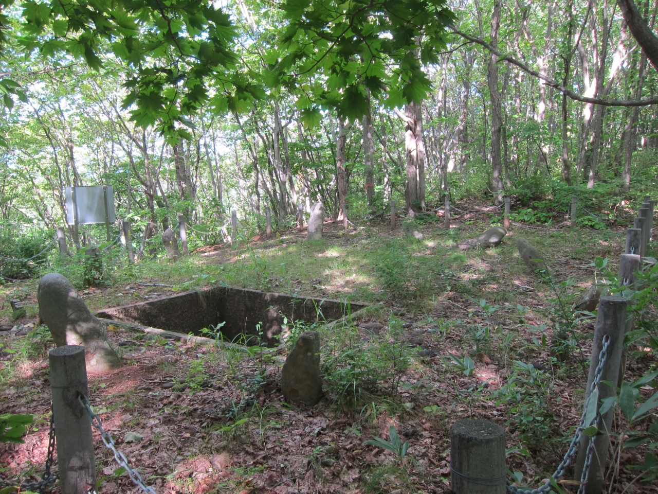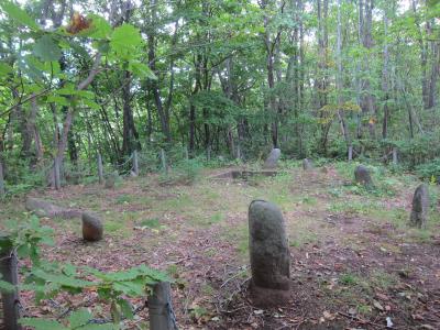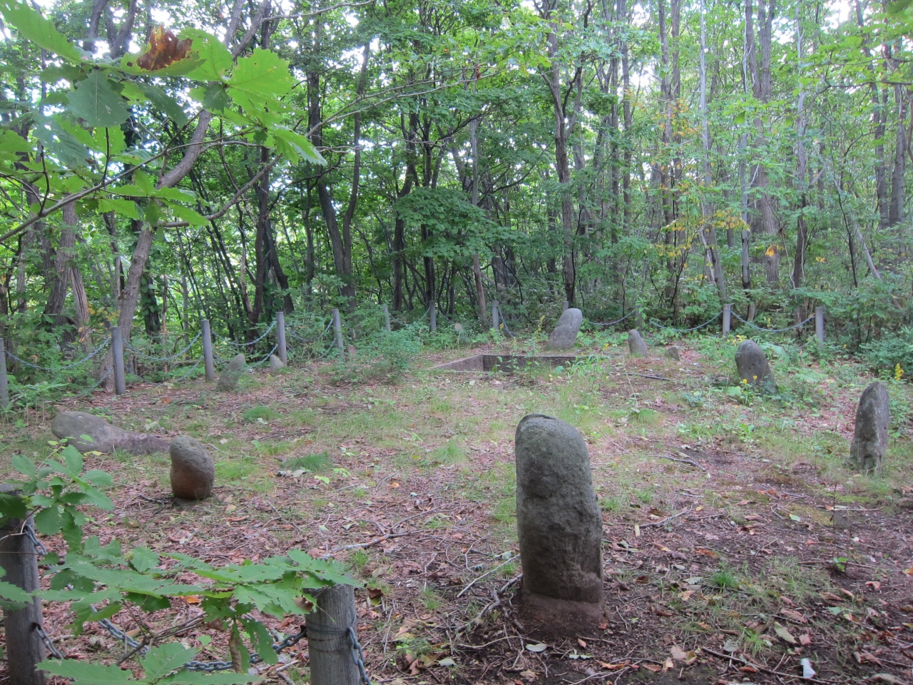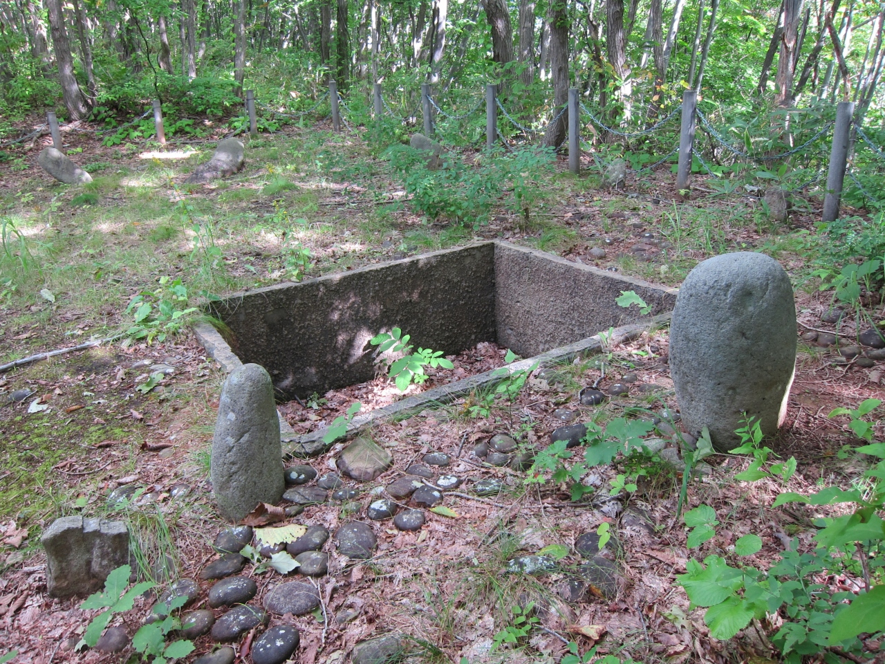 森の中にあり、周囲の視界はほとんどありません。列石とおぼしき石が数個、円形?に並んでいるほか、四角い溝が掘られています。説明看板が立っており、溝は墓の跡のようです。森の中の墓…周囲に人は誰もいません。