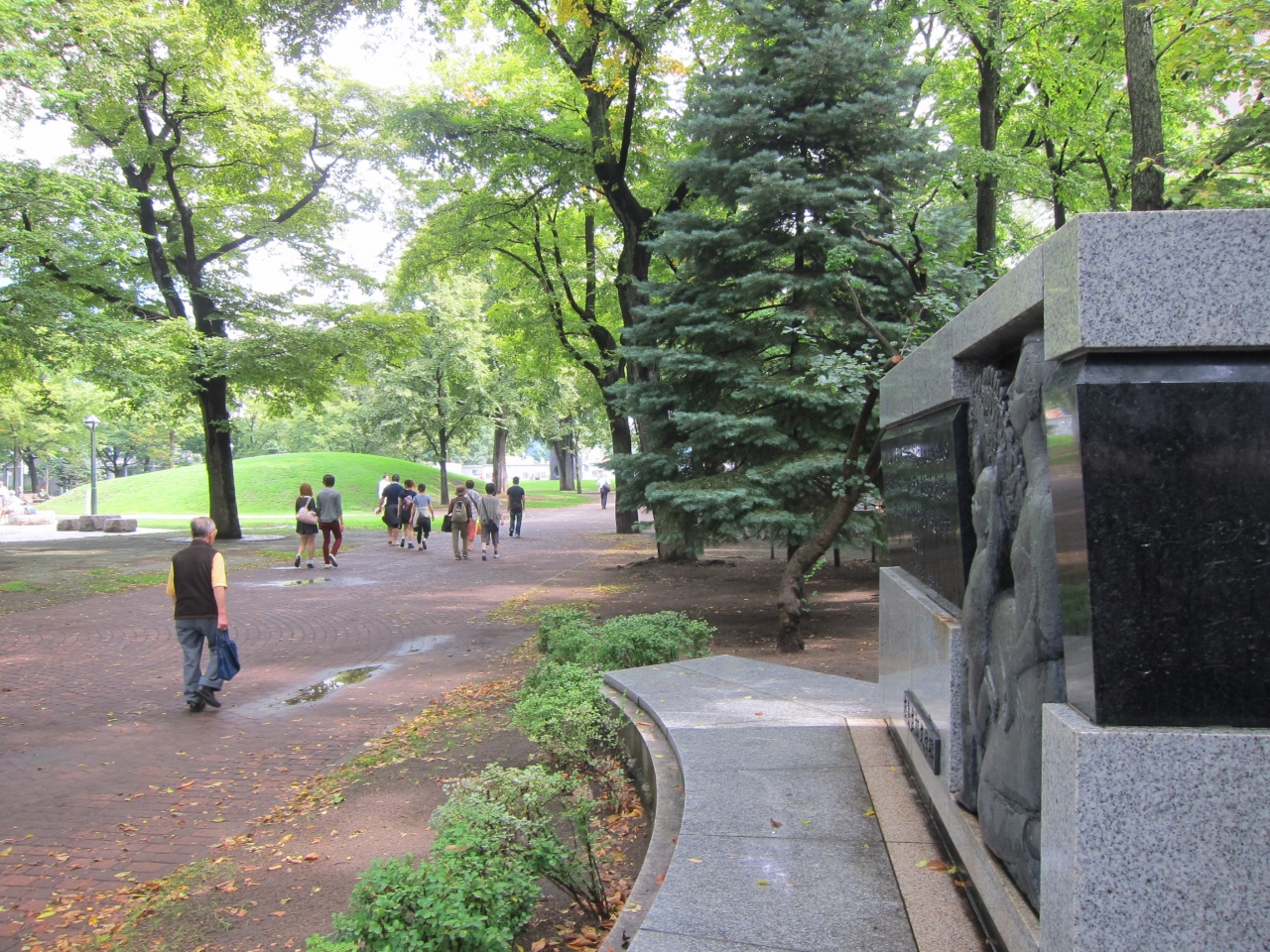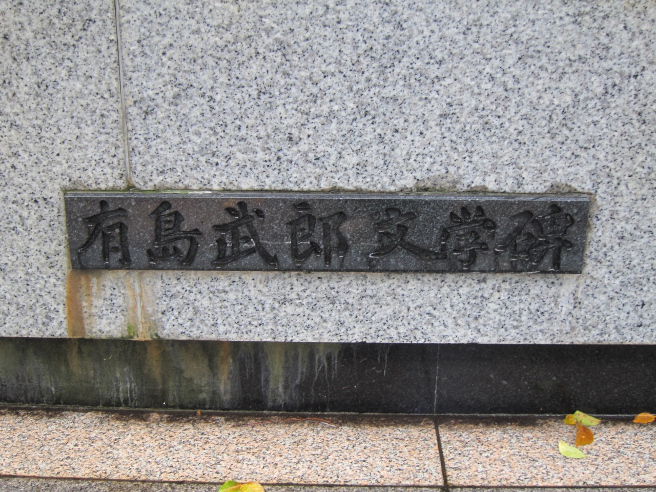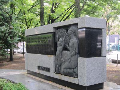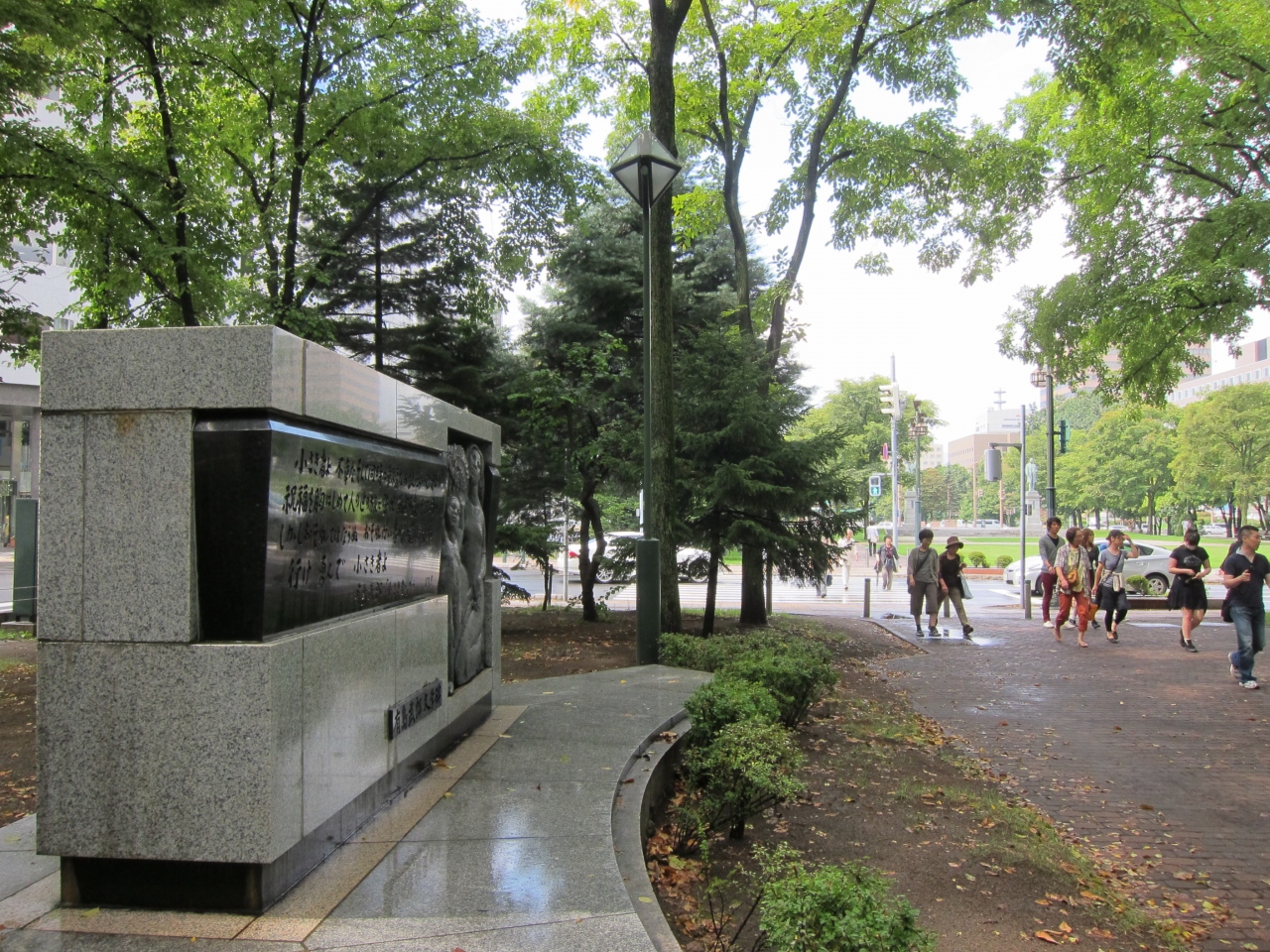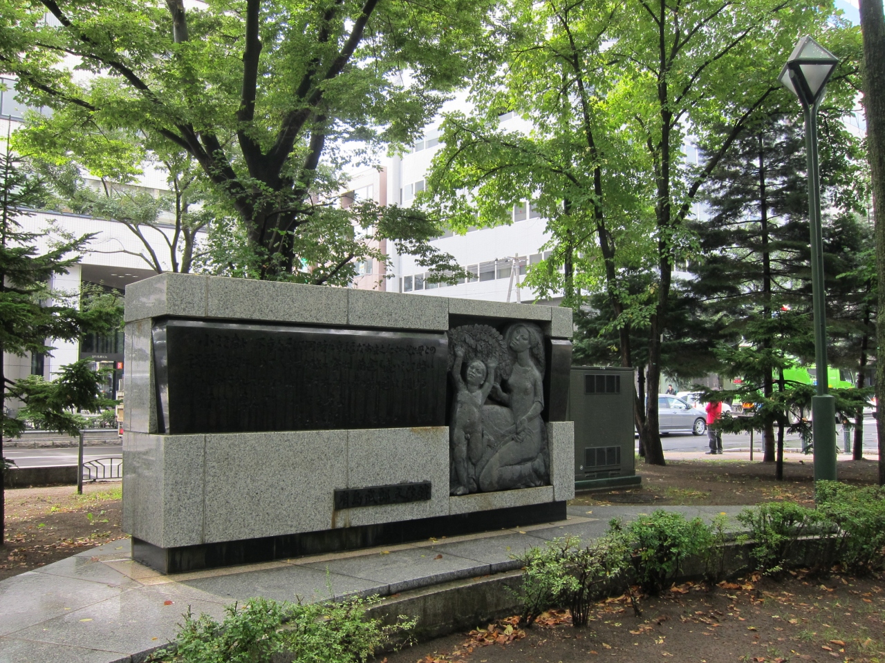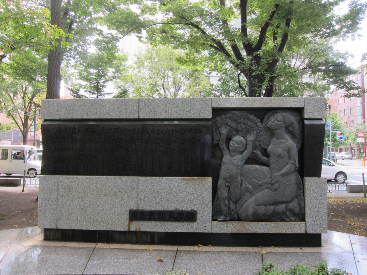 大通公園の西9丁目エリアの南西角にあります。公園の木立に囲まれ薄暗く目立たない感じです。母子のレリーフと、何が書いてあるか読みにくいですが、有島の作品「小さき者へ」からとられた次の文章が刻まれています。