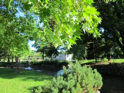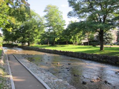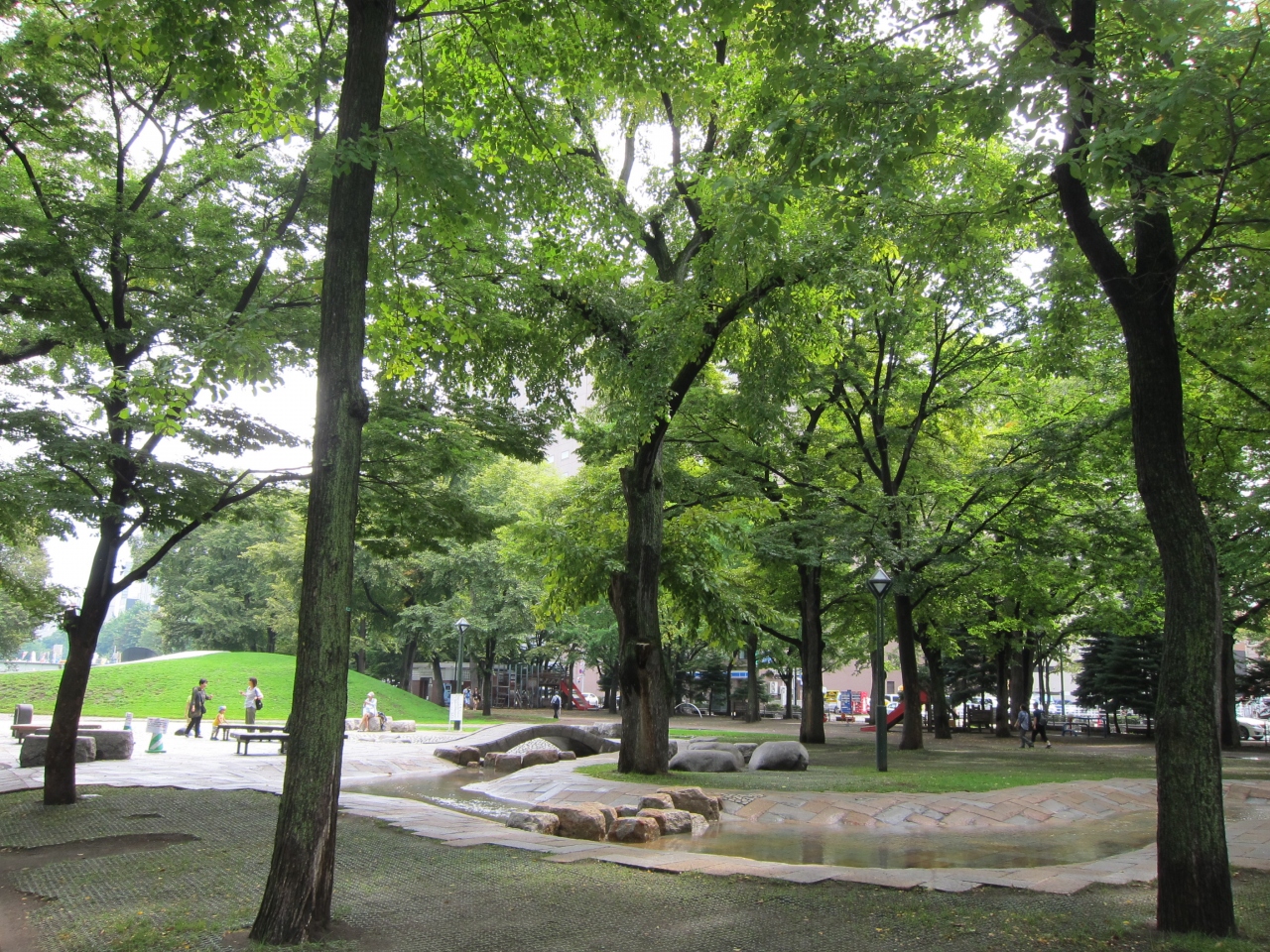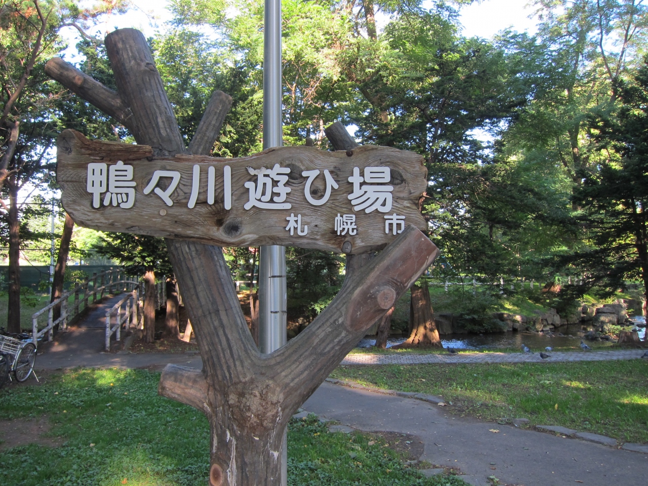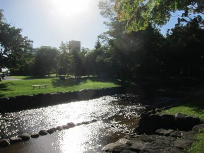中島公園の中での流れは浅く、子どもが遊べるような緩やかなせせらぎとして整備されています。特に幌平橋へ向かう行啓通の南14条橋の北側あたりは、川面に降りていく小径やベンチなどが整備され、遊びにはうってつけ。