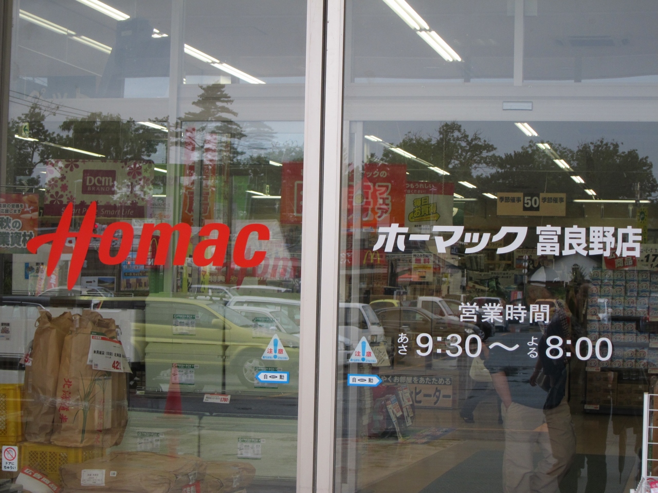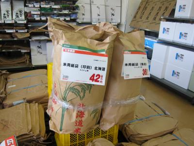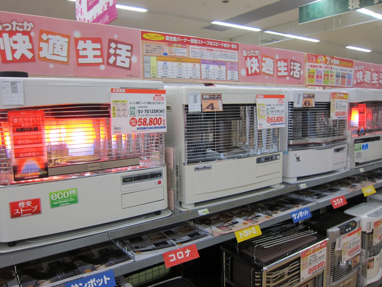 北海道でのDIYの店の代表として各地にあるホーマックですが、ここでは盆地で農作地らしい品揃えがみられました。気温も下がり秋めいてきた9月15日。入口を入ると収穫した米を入れる米袋を売っていました。そして中に入っていくと早くも暖房フェアが。大小さまざまなストーブが既に並んでいました。