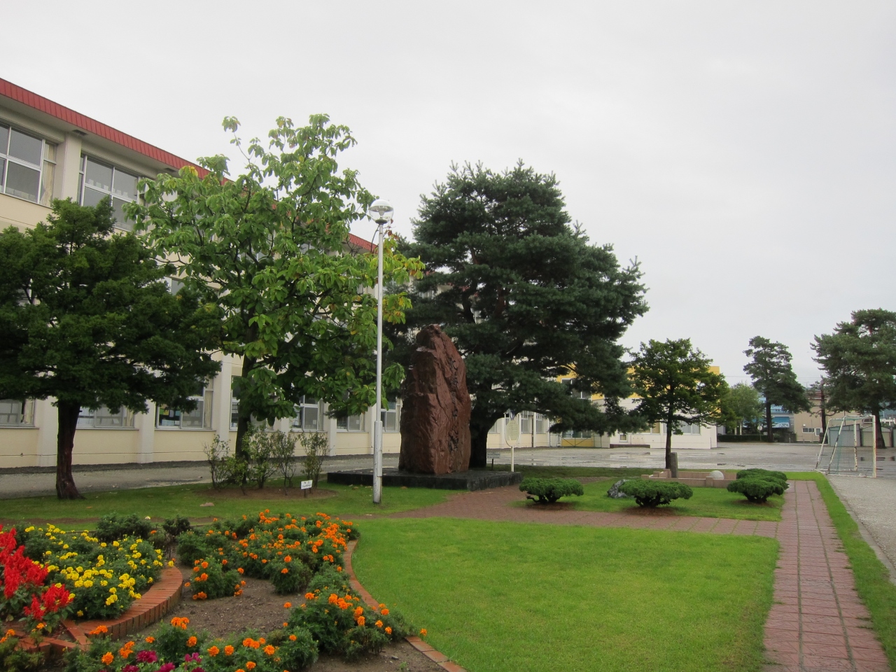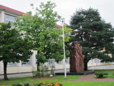 まず、小学校に着くと東側の児童が利用する建物の昇降口がある方は、関係者以外立入禁止の看板も立っていて入りにくい雰囲気です。それに中心標のようなものは見当たりません。そこで西側に回りこむと、へそ祭りの人形がありました。校舎の前の花壇や庭園樹が植わっている先に「北海道中心標」と書かれた赤っぽい大きな岩がありました。やっと見つけました。