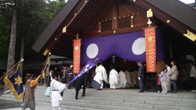 毎年6月14~16日に開催されます。それより前の6月上旬にはよさこいソーラン祭りが開催され、連続するお祭りに札幌市内も華やいだ雰囲気になります。本州ではこのころ梅雨に入る時期ですが、温暖化の影響か最近ちょっと気候が変わってきたとはいえ、北海道ではまだ初夏の爽やかな晴天でお祭りにはもってこいです。山車や神輿の行列が市内を練り歩き、北海道神宮の境内や中島公園などでは屋台が多数出て縁日の賑わいをみせます。祭りのWebサイトでは行列のコースや通過時間などが地図とともに出ているので、行く前に参考にするとよいと思います。
