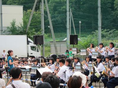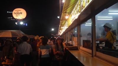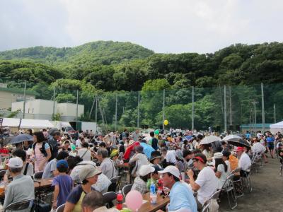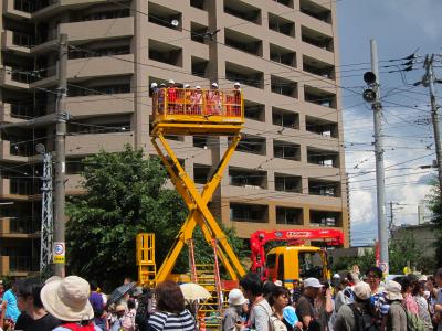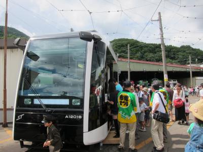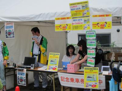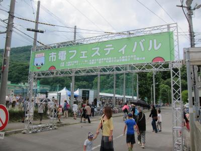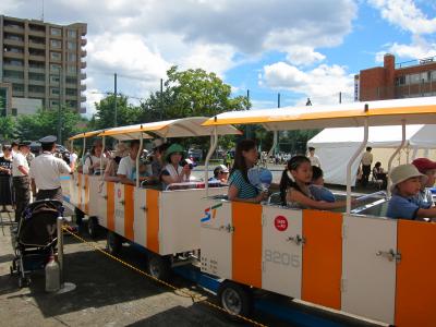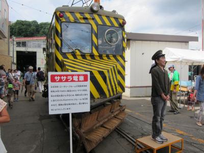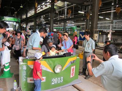市電の電車事業所を一般公開したお祭りです。市電の車庫および隣接するグラウンドに模擬店などが軒を連ね、運転台の開放や高所作業車両乗車ほか体験コーナーや、車両との撮影会等々、各種イベントを開催しています。祭りを記念したウィズユーカードなどは30分後には完売していました。ほか、各種記念商品を販売していましたが、人気商品やスタンプラリーには長蛇の列ができていました。10時からの開催ですが、目当てのものがある場合は早くから会場に行く必要があります。会場はとにかく子供でいっぱいです。グラウンドの食べ物の模擬店はどこも長い列ができていましたが、ビールのところは誰もいませんでした。なお、グラウンドには100席以上はあるテーブルが並べられ、地元の中学校のブラスバンドの演奏など様々なパフォーマンスを見ながら食べることができます。ひどい人混みの会場をあとにして帰る途中、ゲリラ雷雨に遭いました。会場では車庫の一部や事業所の建物の1階のトイレを開放していましたが、あの人混みを収容できるスペースは無かったはずです。皆さんどうしていたのでしょうか。