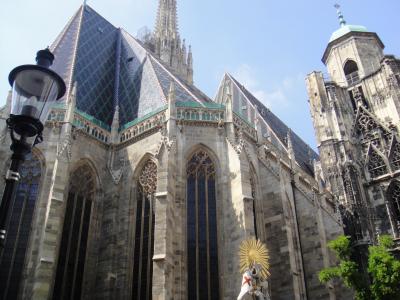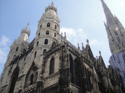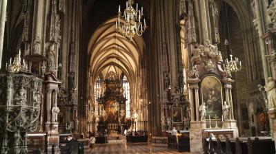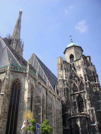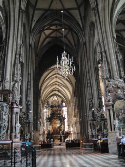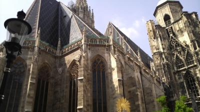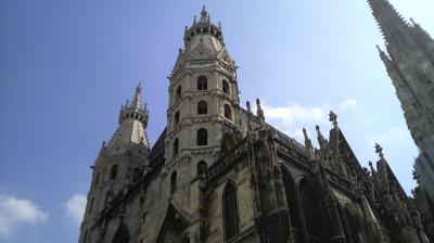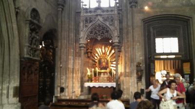 お昼に行きました。ちょうどミサをやっていて聖堂内を歌声がこだまし、とても雰囲気がありました。しかし、規制されていて中の方まで入って行けず、他の観光客たちと一緒に、遠く、格子の外から歌声を聴きながら眺めていました。町並みの散策もかねて西駅(Westbahnhof)近くの宿から歩いてきたので、終わるのを待って塔に登る気力がなかったです(北塔はエレベーターが使える。南北ともに有料。)。