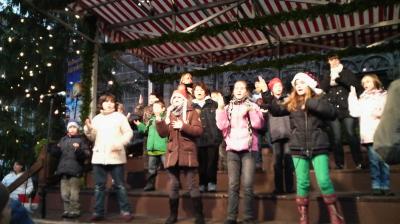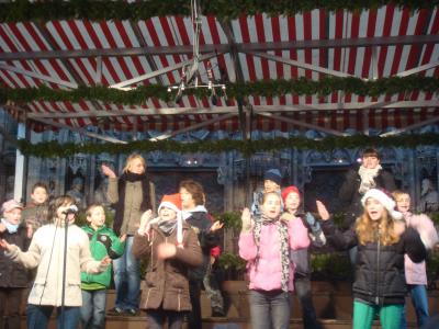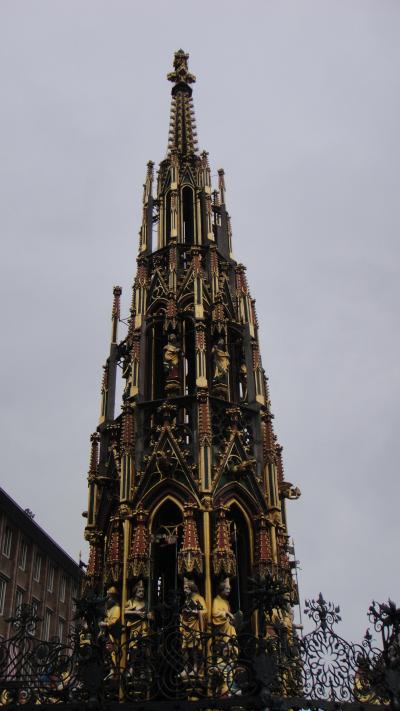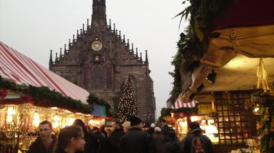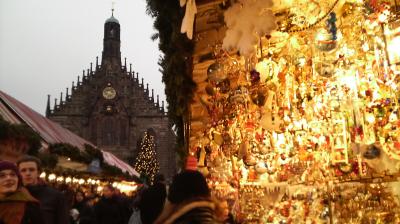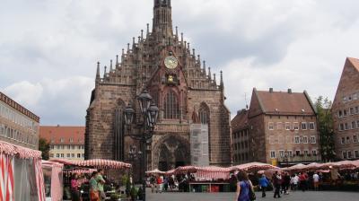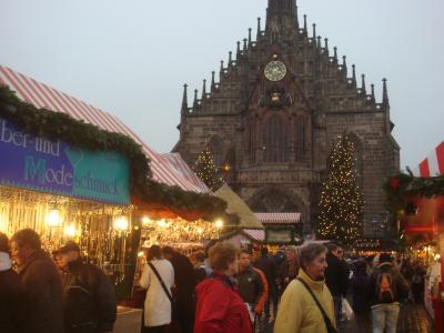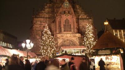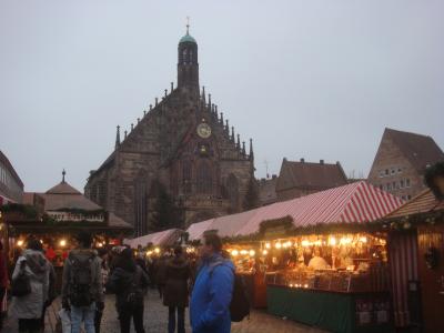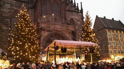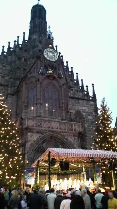 ニュルンベルクの駅から1km弱、ケーニヒ通りをまっすぐ、ペグニッツ川を越えたところにあります。夏と冬に行きました。夏は目の前の中央広場に果物などの露店が並んでいました。朝早かったので教会の中も人はまばら。パイプオルガンの練習をしている人がいましたが、音の響く教会の中でのオルガンの音色はとても良かったです。そして冬はなんと言ってもクリスマスマーケット。広場にはクリスマスオーナメントやグリューワイン、ブルストなどの露店が並んでいます。建物の中のレープクーヘンの店なども相当な込み具合でした。教会前の特設ステージでは子供たちのクリスマスソングが響いていました。