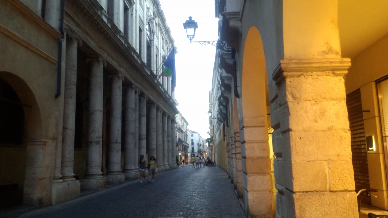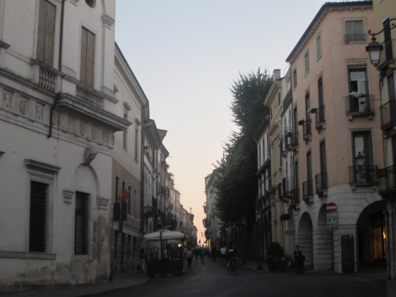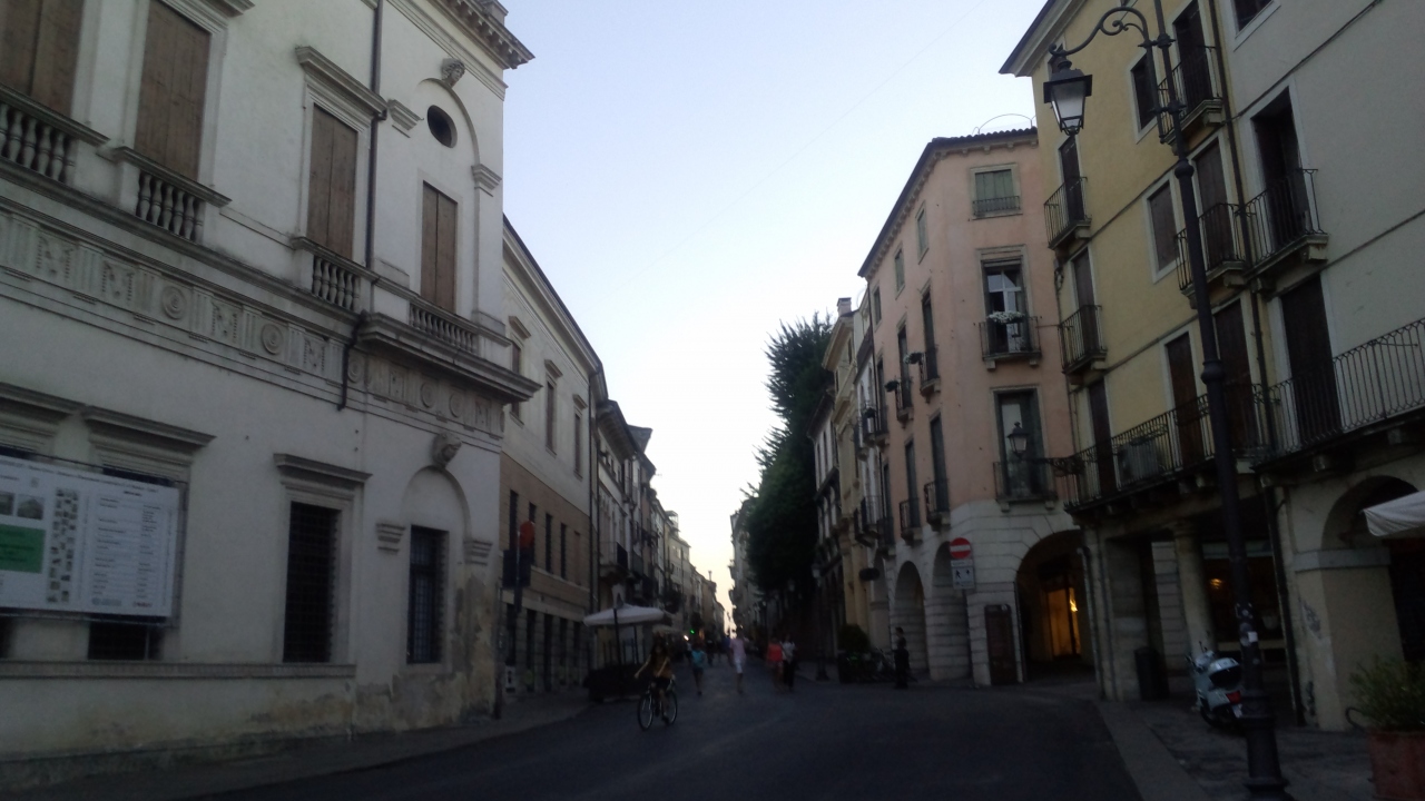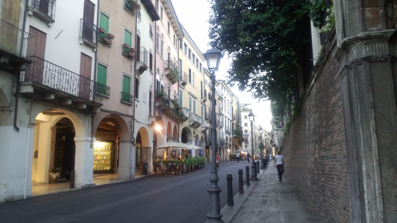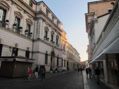 ヴィチェンツァの駅から正面の通りを500mほど行き、通りにつきあたった所で右に曲がり、門をくぐって1~2kmほど続く石畳の通りです。割合、人通りが賑やかで、服や食べ物を売る店があちこちにありました。途中、ドゥオーモやバジリカに入っていく小径があります。ずっと最後まで行くと、キエリカーティ宮があります。ほとんど平坦な道ですが、最後の方だけ下り坂となります。カフェやジェラートの店もあるので、いろいろ散策しながら行くとよいと思います。