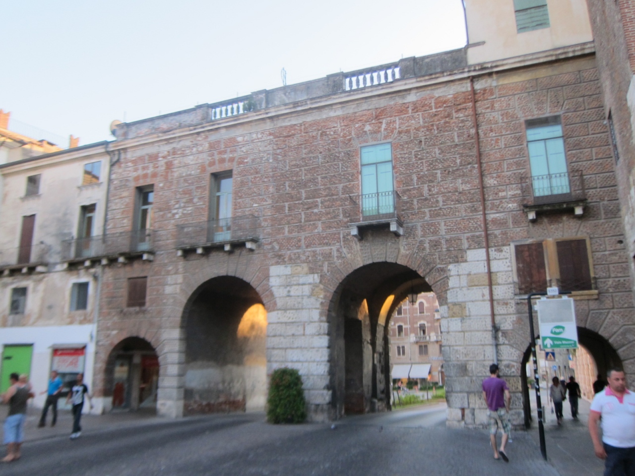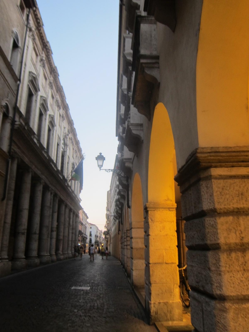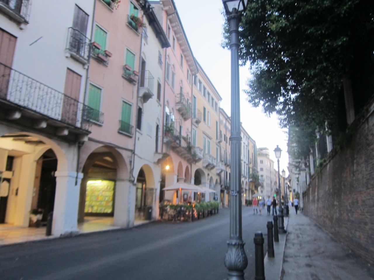 ヴィチェンツァの駅から正面の通りを500mほど行き、通りにつきあたった所で右に曲がり、門をくぐって1~2kmほど続く石畳の通りです。割合、人通りが賑やかで、服や食べ物を売る店があちこちにありました。途中、ドゥオーモやバジリカに入っていく小径があります。ずっと最後まで行くと、キエリカーティ宮があります。ほとんど平坦な道ですが、最後の方だけ下り坂となります。カフェやジェラートの店もあるので、いろいろ散策しながら行くとよいと思います。