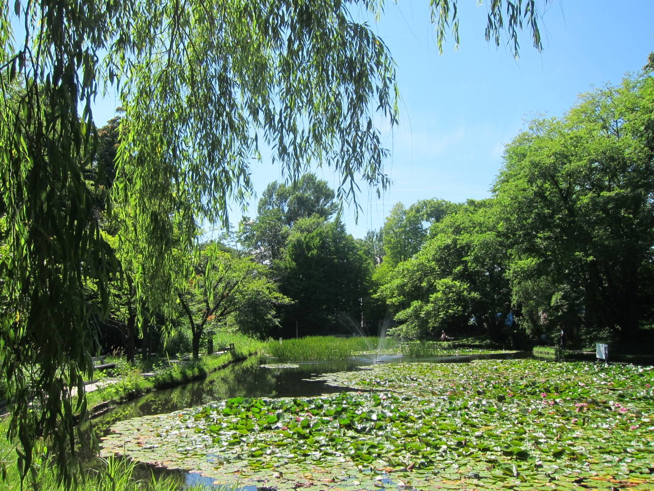 北海道大学の中央部にある池です。大学を散策した際に寄りましたが、正門からは道なりに700~800mほどと、距離があります。ここまで来ると近くにあるイチョウ並木(北13条)もあわせて寄るとよいと思います。池にはベンチがあり、近所の人や学生さんの憩いの場となっているようです。隣にレストランや大学生協があって、食事や物の購入もできるので池での休憩に便利です。池の周りに木が植わっていたり、池には水草や睡蓮の花が咲いていたりと、結構緑の多い環境なので、散策の疲れが癒されます。