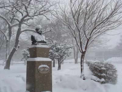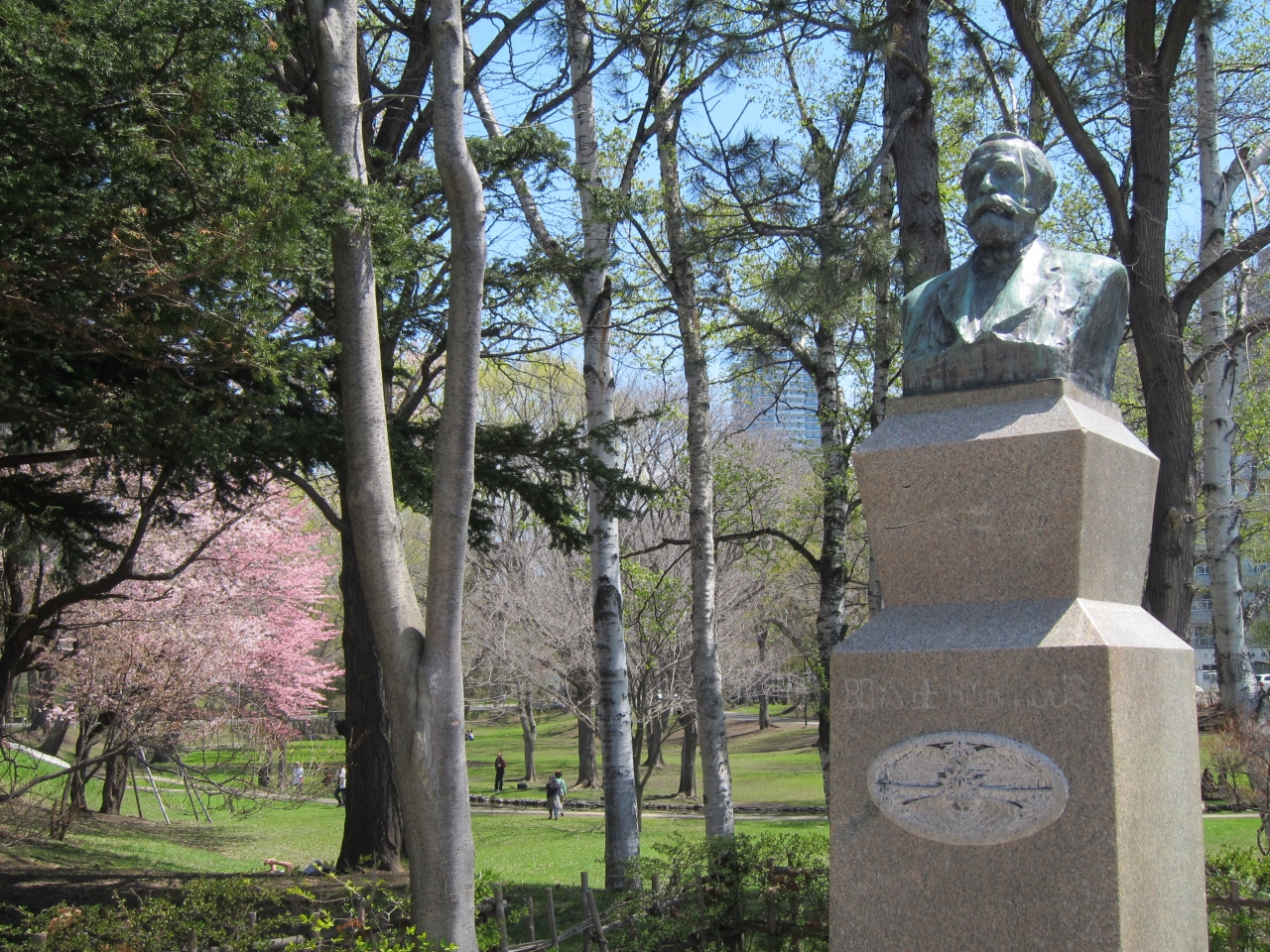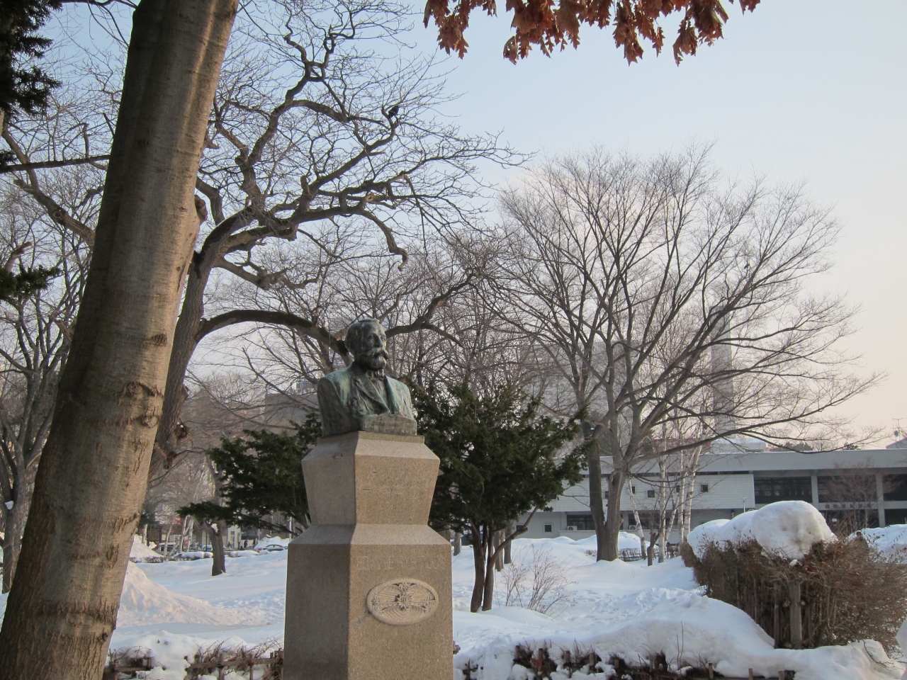 北海道を代表する風景でもあるクラーク像は、羊が丘展望台にあります。しかし、本家の北海道大学にもクラーク像があります。こちらは胸像ですが、札幌駅から近いので観光しやすいです(羊が丘は札幌駅からバス(夏期のみ)で40分)。場所は正門を入って300mほどのところにあるロータリーの一角です。札幌駅からも500~600mのところです。赤レンガの北海道庁も近いですが、ここも、駅で時間が余ってしまった場合のちょっと手ごろな観光名所だと思います。