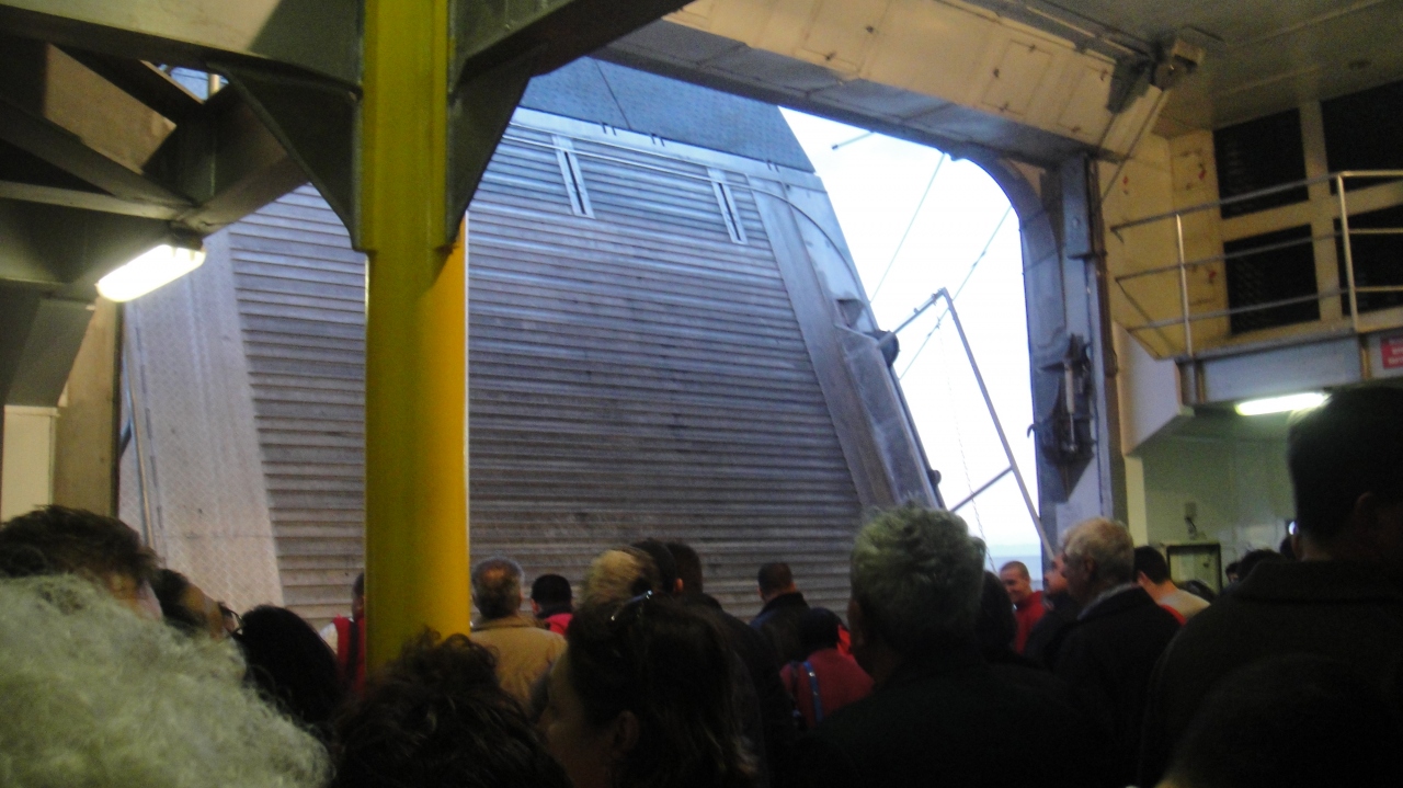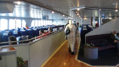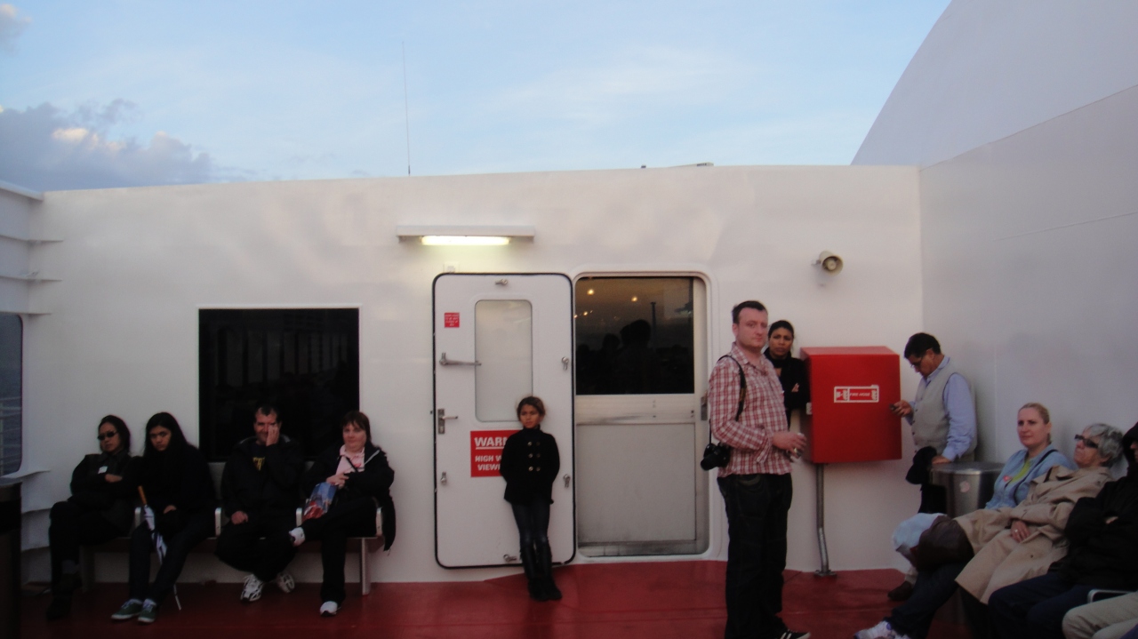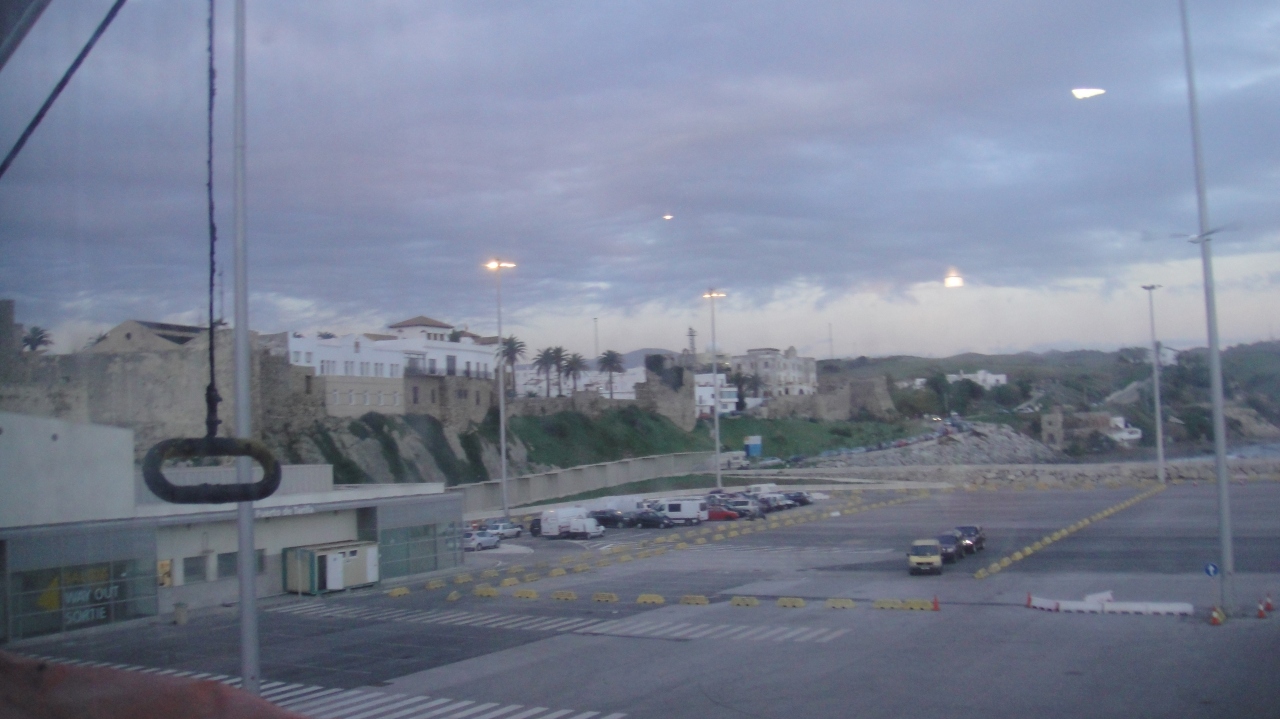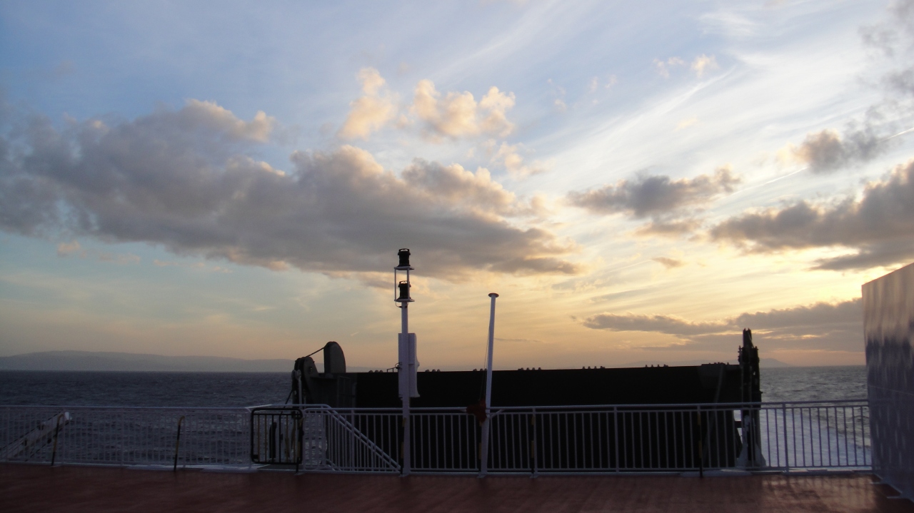 モロッコのタンジェからスペインのタリファまで利用しました。高速船で35分。行きのスペインのアルヘシラス~タンジェが2時間以上かかった普通便(ほかに出航の遅れなどが重なった)とは大違いの速さです。タンジェの港で勧誘されました。アルヘシラスの便の所要時間に辟易していたのと、あと15分くらいですぐ出航とのことだったので勧誘にのってみることにしました。料金は日本円で4,000円くらいだったと思います(当時、1ディルハム=12円)。ユーロ払いもできました。タリファからアルヘシラス(港)までの専用乗り継ぎバス代込みということでした。急いで事務所に連れて行かれ、パスポートを確認しながら出国書類を作成。フェリーターミナルでの荷物検査など出国手続きもあっという間。そして乗ってみるとこれがとても速く、昔、青森~函館を1時間半で結んでいた高速船(なっちゃんレラ)みたいな速さで海上をみるみる進んでいきます。それに船内は日本のフェリーみたいにきれい。夕暮れの中、離れていくタンジェの景色を後部甲板で風に吹かれながら眺めていました。それにしてもあっという間の船旅でした。タリファに到着すると、車も出る船倉の横から降りるのが少しいただけない感じがしますが、フェリーターミナルで入国審査後、ターミナル横に待っていた連絡バスで20分あまり。あっという間にアルヘシラスの港に到着です。おかげでアルヘシラスでゆっくり食事をする時間がとれました。料金は普通便の3倍くらいしましたが、ノンストレスで大満足です(普通便では船内のロビーで長い行列を作って入国手続きです。所要時間も長かったですが、手続きのため立って並ぶ時間も長くて疲れました(審査員ノロノロ)。まあ、安い船会社を選んでしまったのもありますが…。)。
