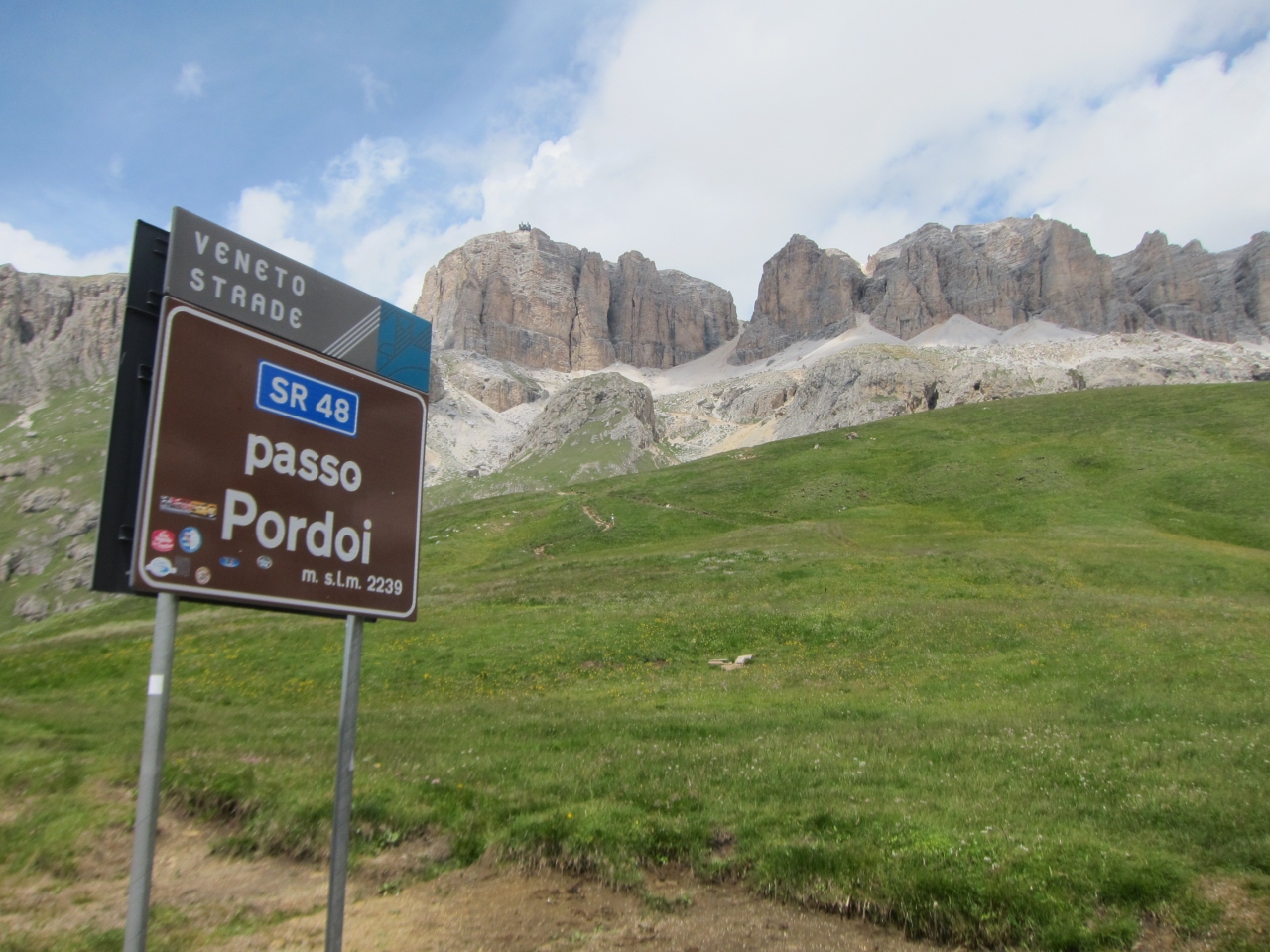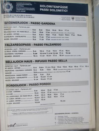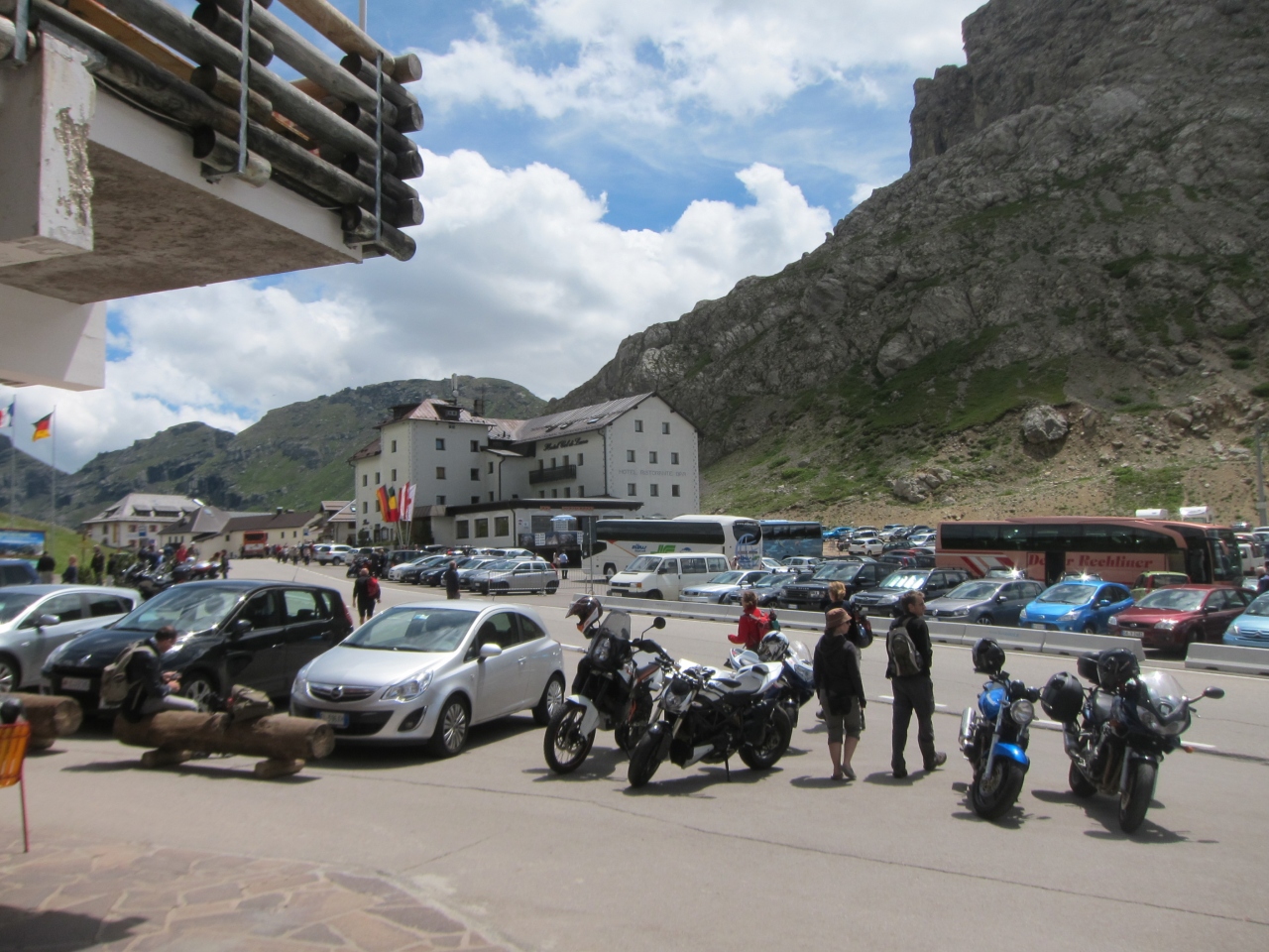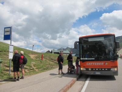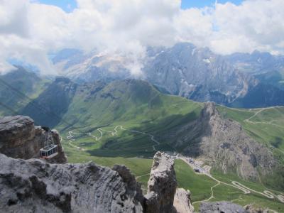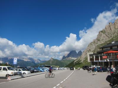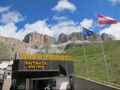標高2239mの峠から2950mのサッソ・ポルドイへロープウェイ(funivia)がでています。峠にはロープウェイ駅に併設してカフェやお土産屋が入ったレストハウスがあるほか、ホテルもあります。観光客のための広い駐車場もあり、車のほか、ツーリングのバイクや自転車で来た人も多数いました。アクセスですが、バスはここからCanazei(→Bolzano)やPasso Sella、Ortisei、Arabbaなどへ出ていますが、本数が少ないので計画的な行動が必要です。人数が複数いたこともあり、時間を買ってタクシーを使いましたが(Canazeiから呼ぶのに20分ほど時間がかかる)、1万円くらい(1ユーロ=100円)かかりました。
