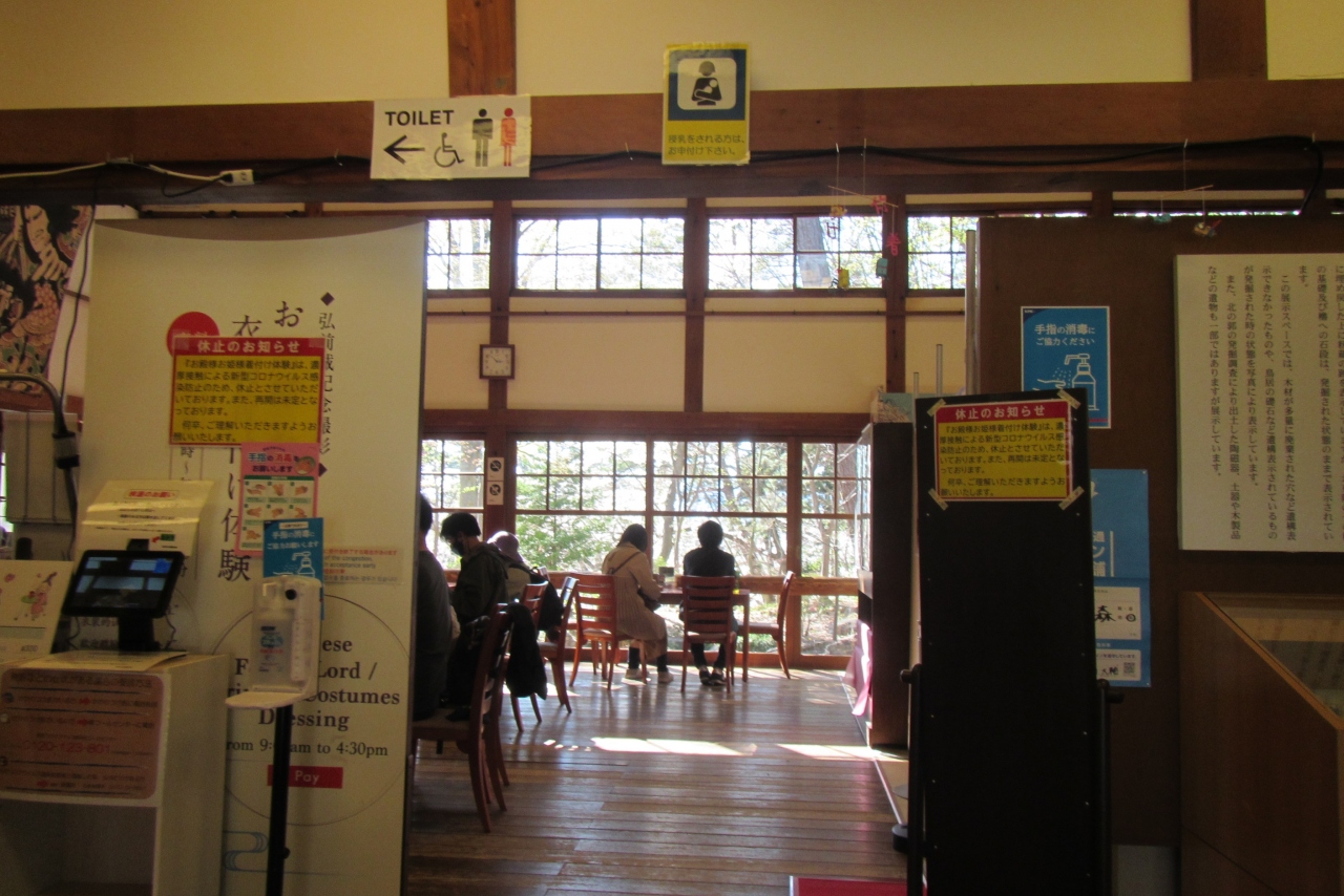 弘前城の有料エリア内(¥320円)にある外観を古いお城の建物を模した喫茶コーナーで、弘前城散策の途中で数少ない室内休憩できる場所であるため、散策の途中に寄るのにとても便利です。