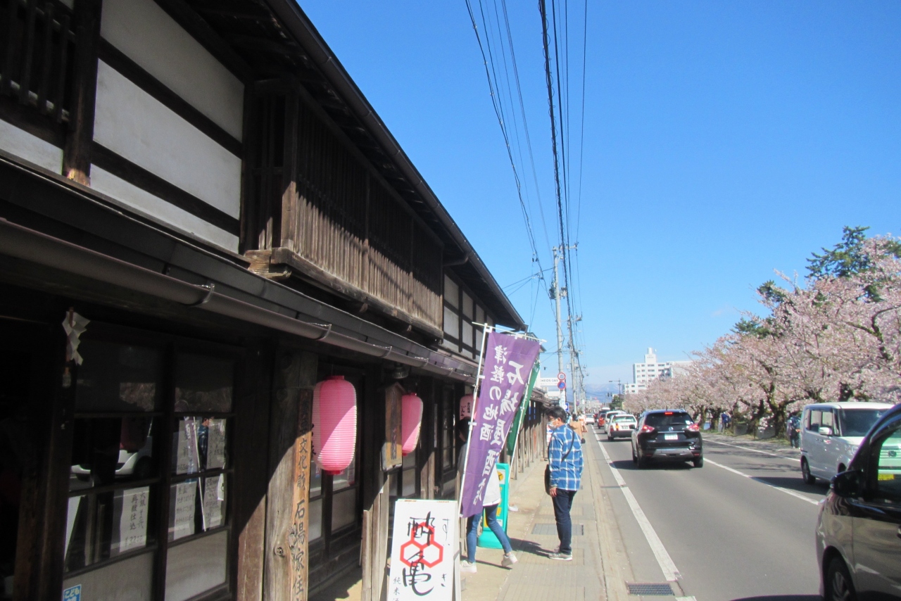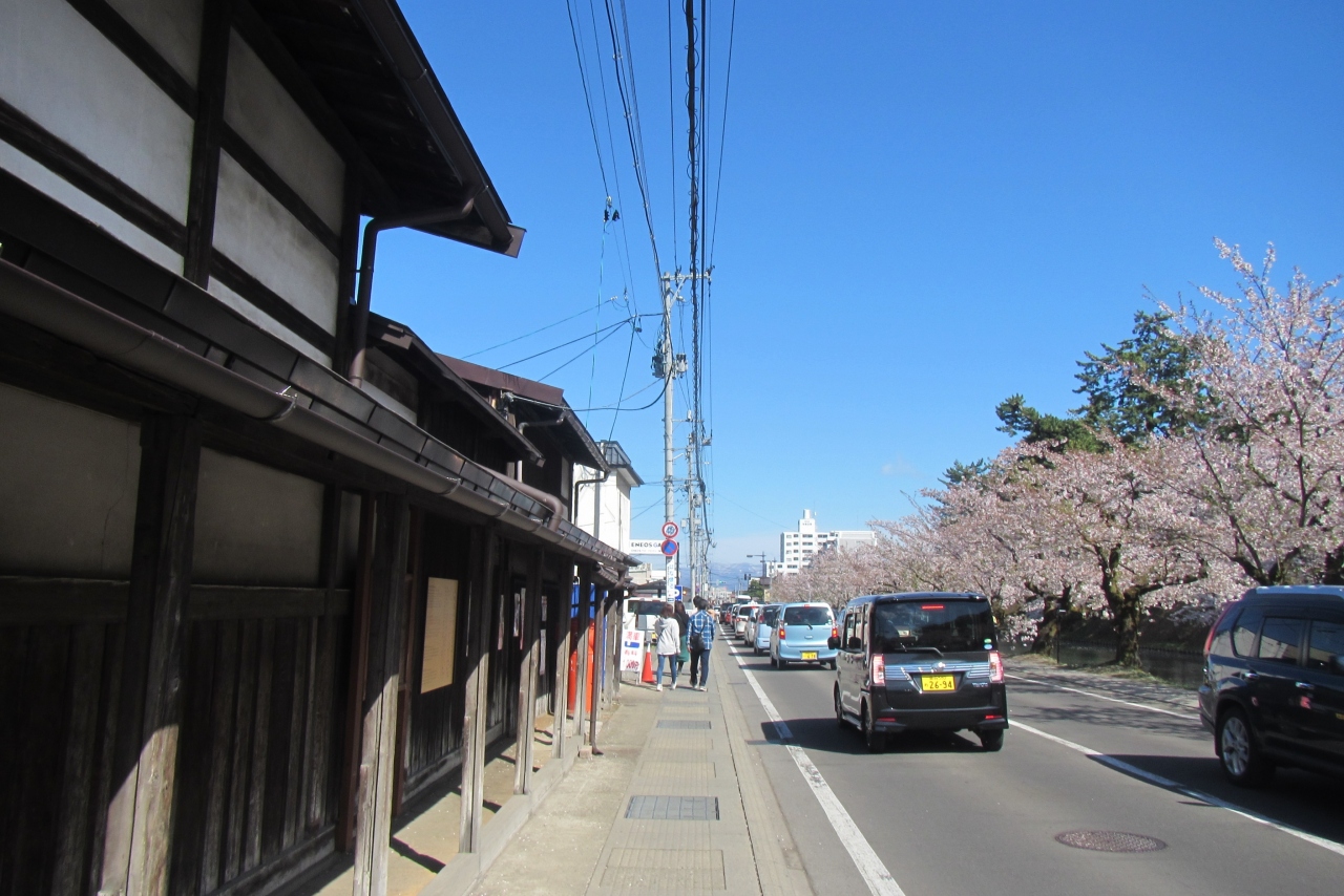 お店の前の弘前公園北側のお堀端には桜が植わり、特にお堀の北東角からは桜並木に花筏浮かぶお堀の伸びる先に津軽富士こと岩木山がきれいにみえるポイントがあるので、ぜひ、食事に引き続いて散策を楽しむとよいです。