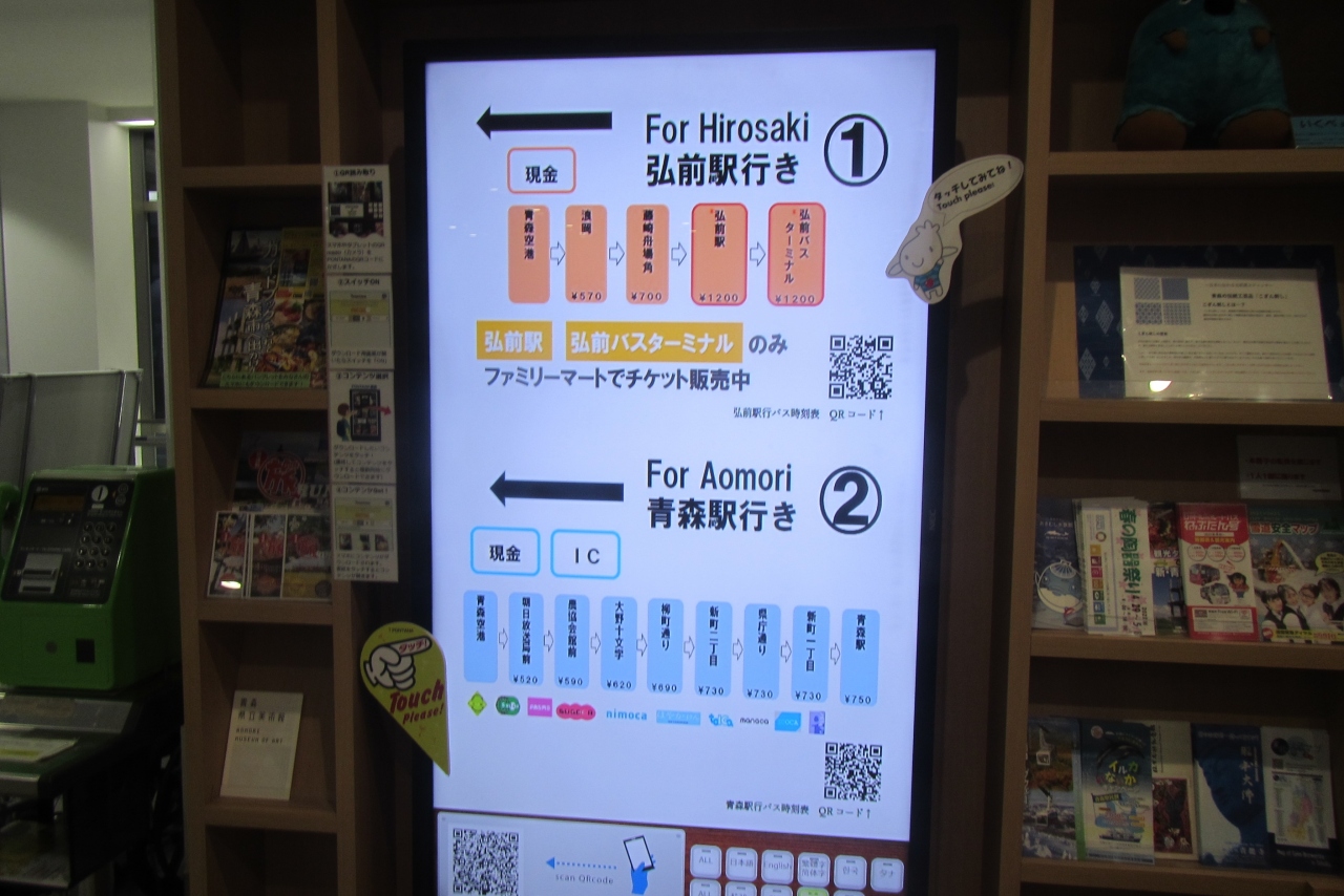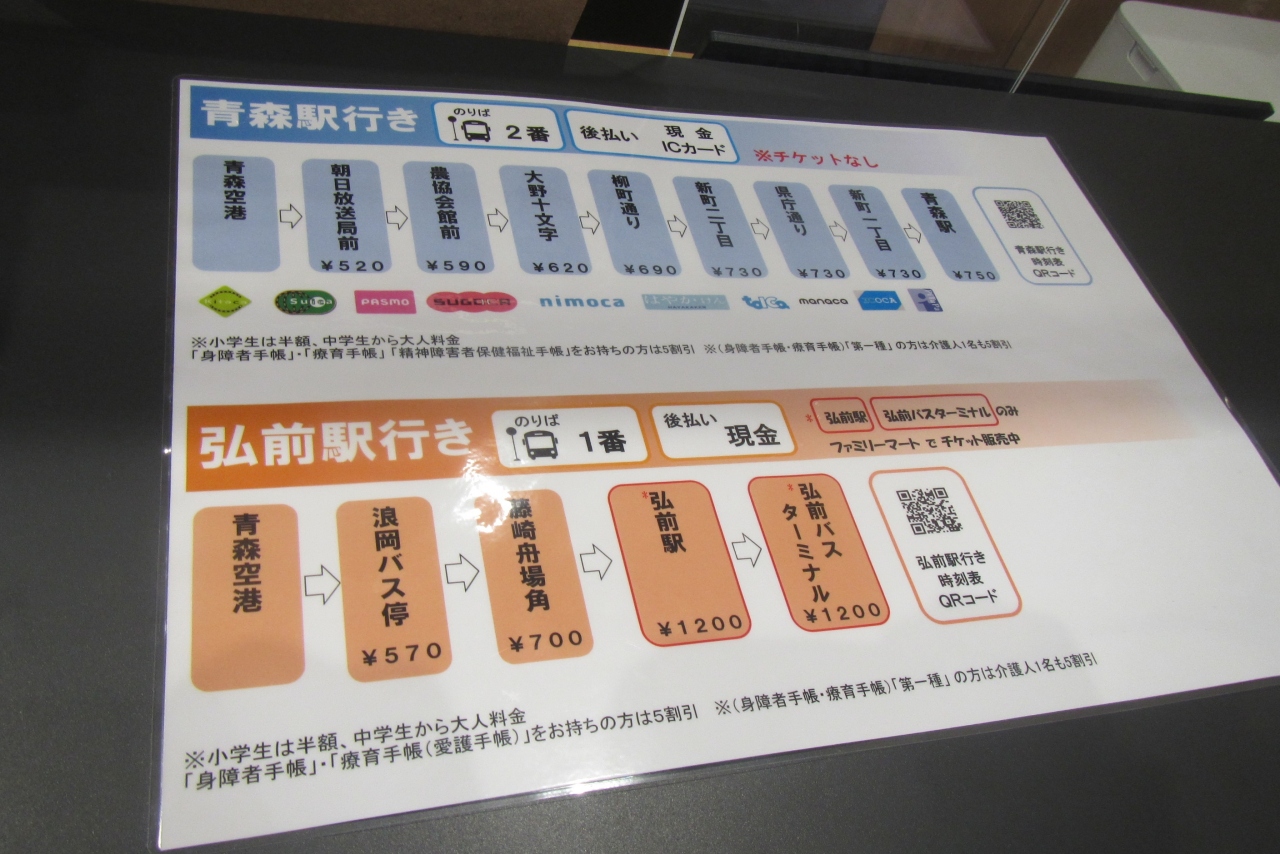 青森駅行きは交通系ICカード可。弘前駅・弘前バスターミナル行きは現金のほか空港コンビニでチケット