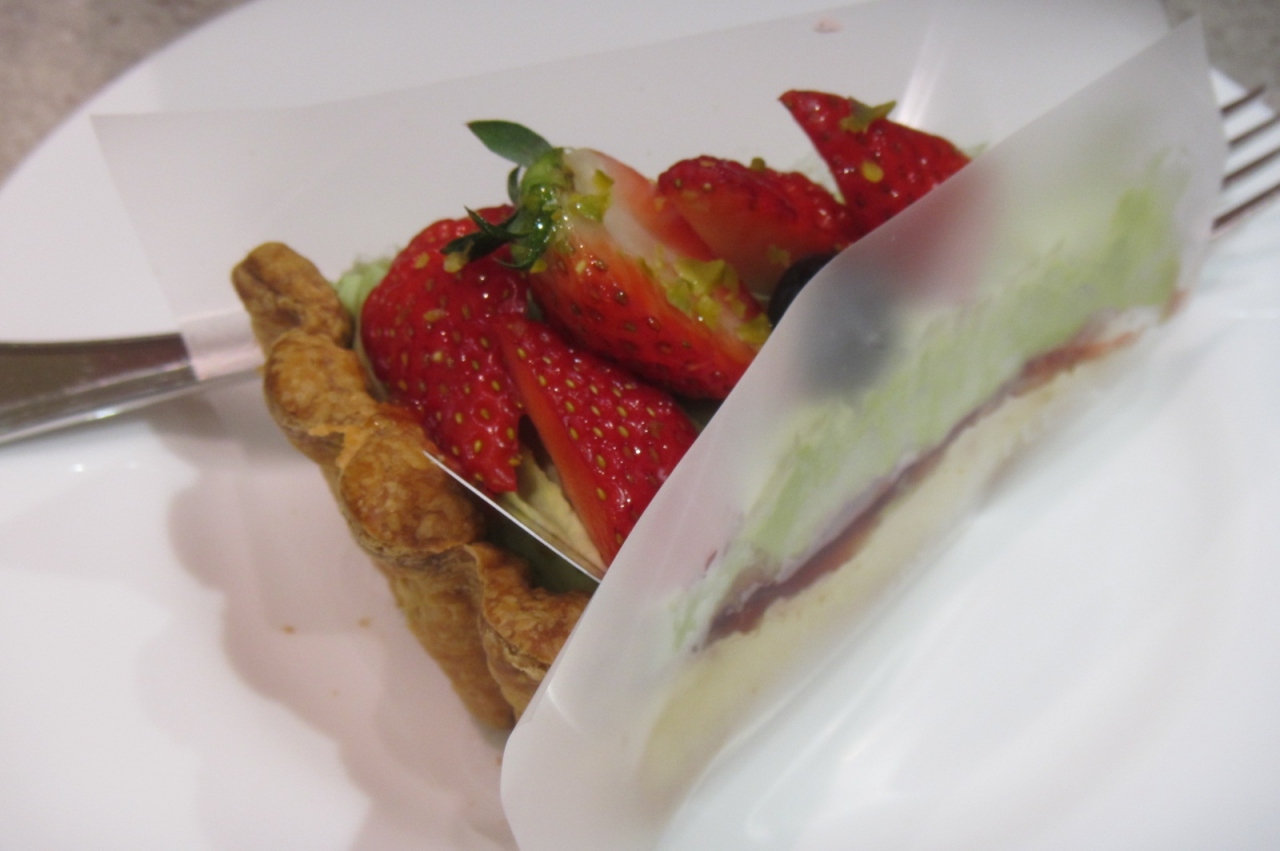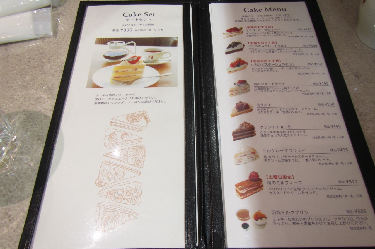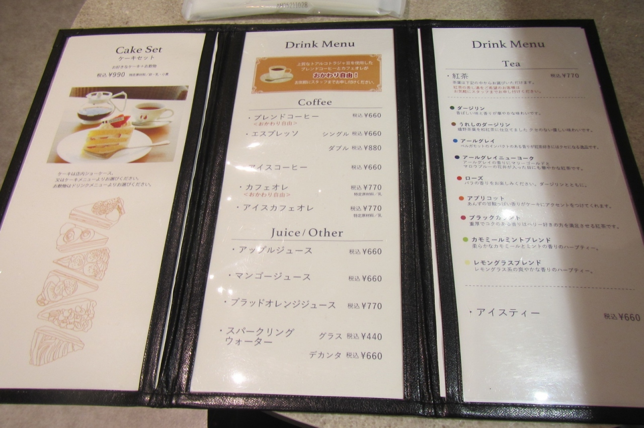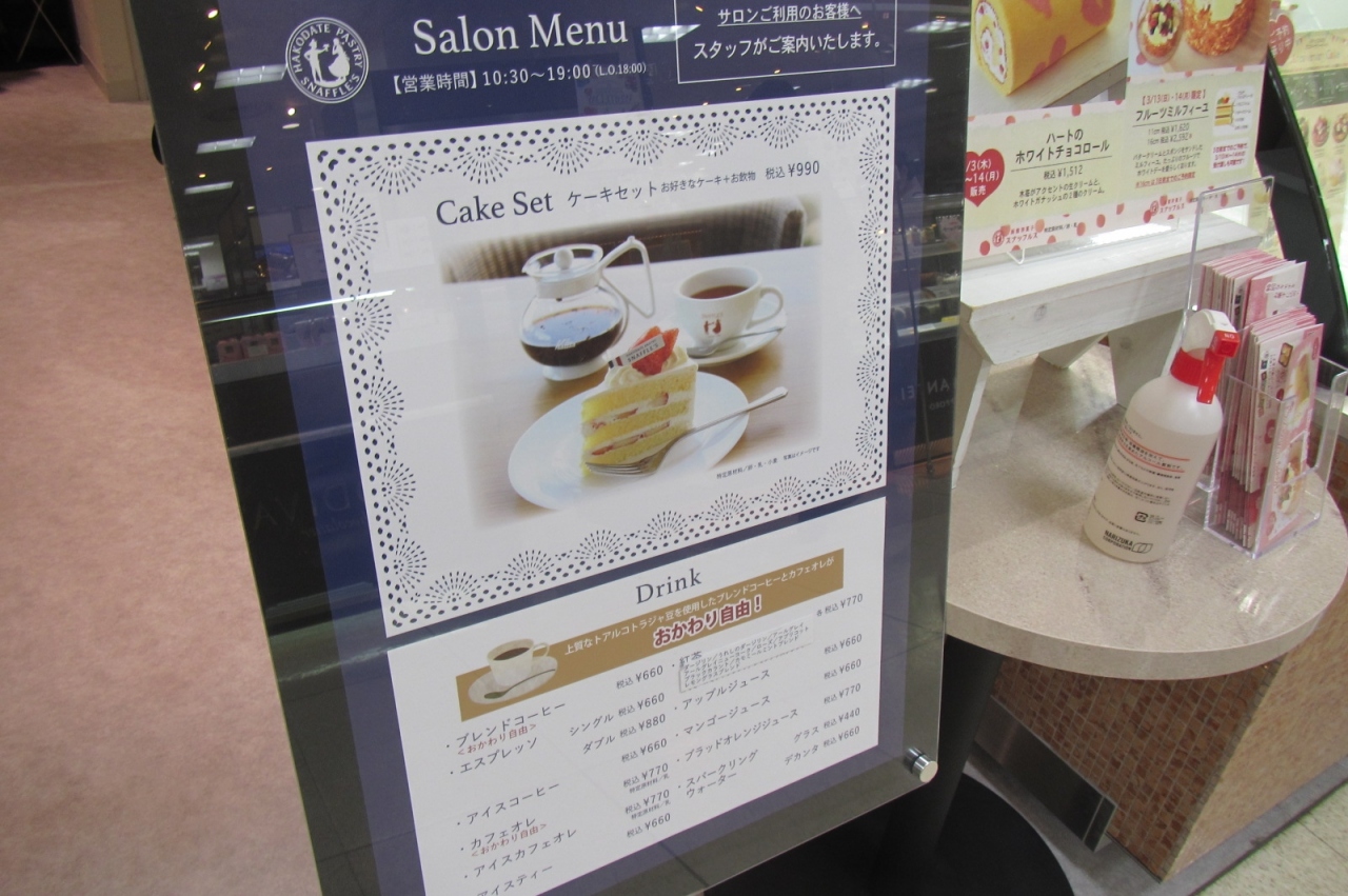 喫茶コーナーは、東急地下入口側の外からガラス張りで見えるパンケーキやパフェ、ソフトクリームがいただけるプールミッシュに比べて地味ですが、スナッフルスではケーキなどがいただけ、ショーケースの中から好きなケーキを選べる「ケーキセット」(ケーキ1点+ドリンク1点 ¥990円(税込み))がメニューにありました。