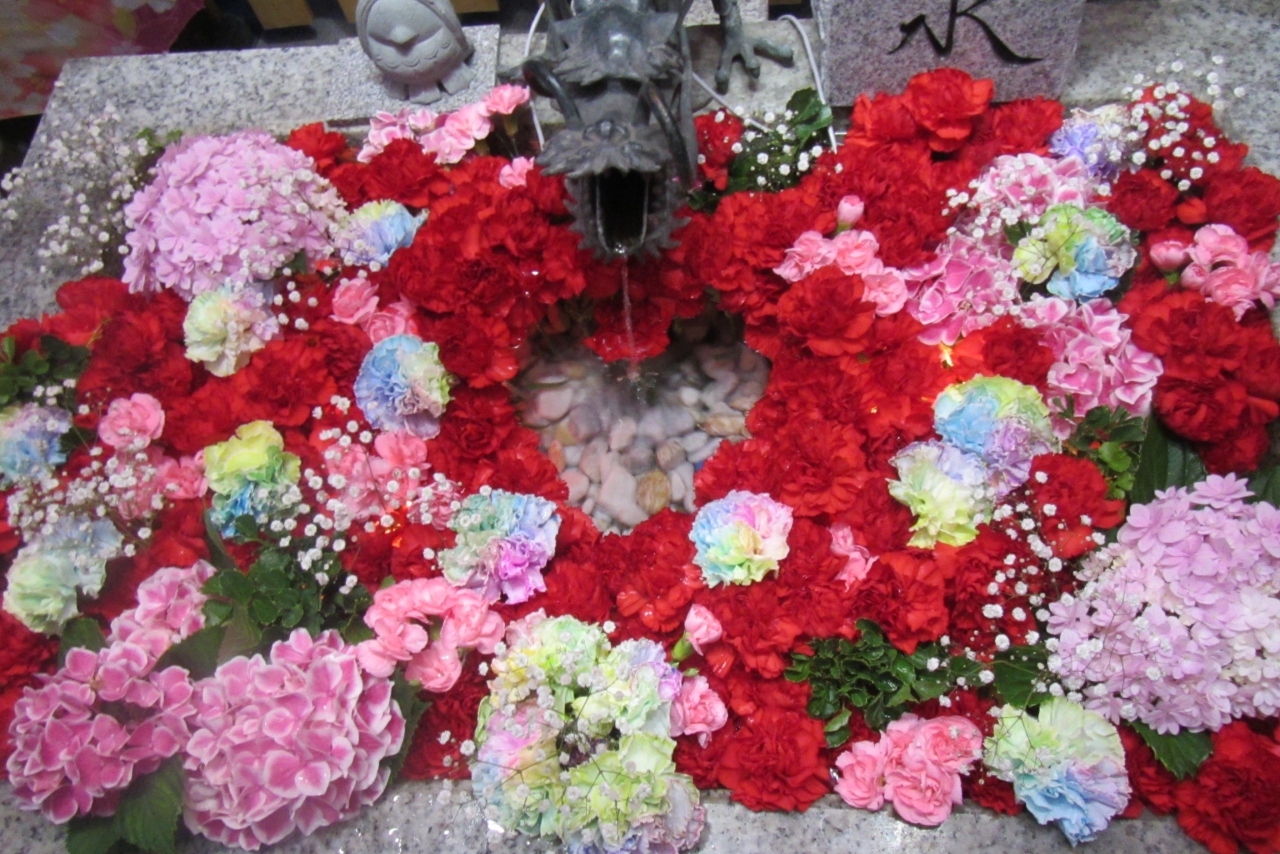 諏訪神社においては、今までも時々花手水が行われていましたが、ここの神社の良いところは夜間も22時まで花手水のライトアップがなされることです。