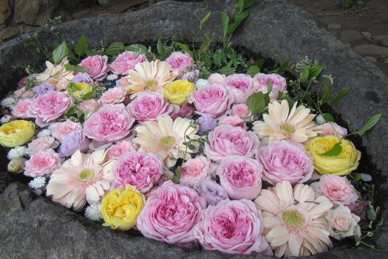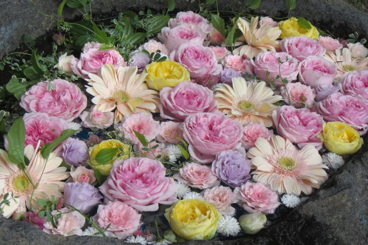 手稲神社においては、参道の石段を上がった本殿前の参道脇に美しい花手水が飾られていました。