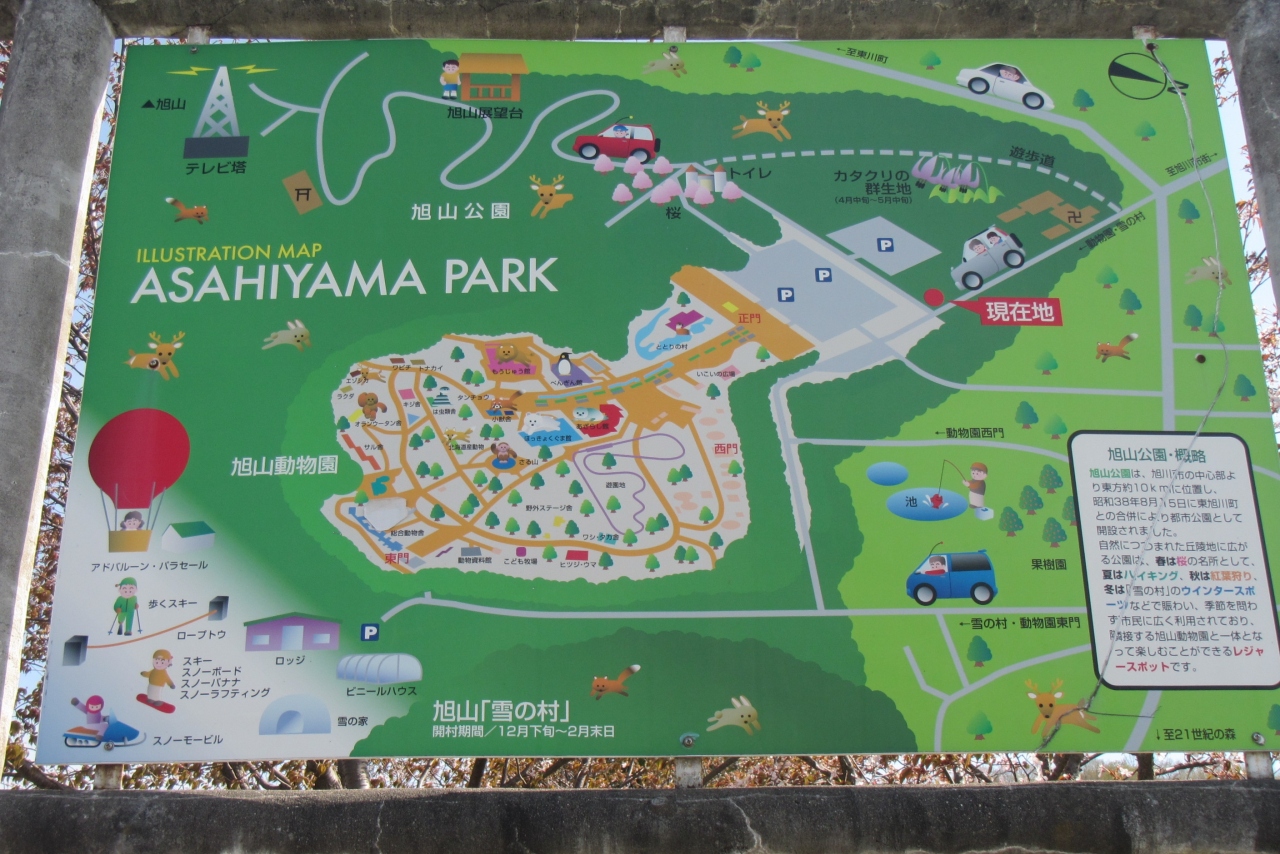動物園のついでに旭山公園を楽しもうとすると、動物園正門前の駐車場横から旭山山頂へと登っていくことが多いようですが、カタクリ群生地などはそこまで訪れる手前の、坂を登り始める前の旭山寺手前辺りの道路脇から入っていくとあって、なかなか場所が気づきにくいと思います。動物園正門駐車場に入る前の旭山公園の案内看板に公園の全体図が示され、カタクリ群生地の場所が載っていました。- 旅行時期