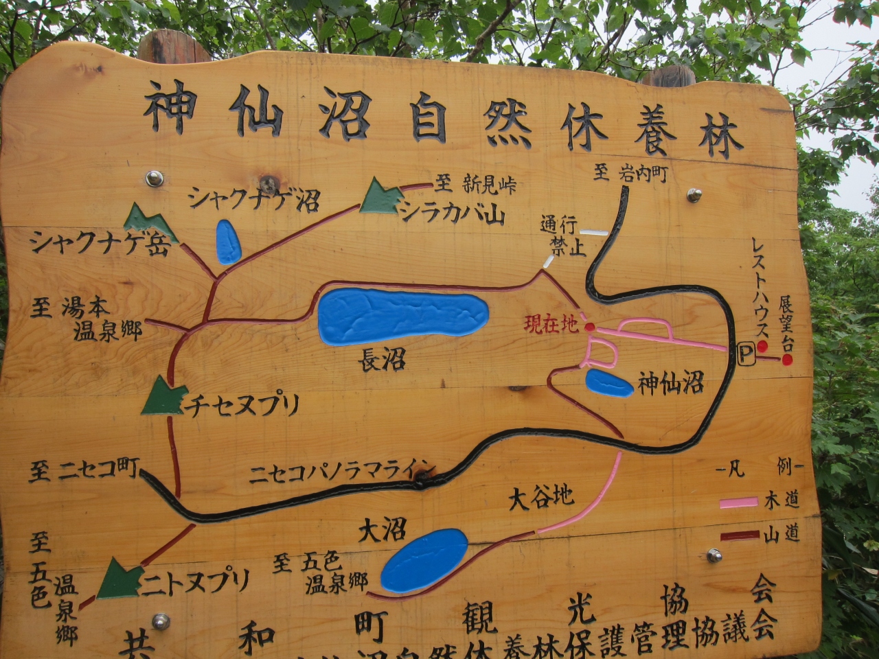 神仙沼の先にある沼です。行った時は霧が立ちこめ、沼の全景を見ることはできませんでした。また、神仙沼と異なり、ごつごつした岩や地面が露出していて、同じく霧立っていた神仙沼のような美しさはありませんでした。こちらは晴れた日だったらもう少し良かったのかもしれません。レストハウスから神仙沼へ行く途中、700mほど進んだところで分岐し、木道および開けた山道を利用して更に600mほど進んだところにあります。神仙沼まで折角来た上に、同様にして比較的簡単に行けるのでついでに寄ってみましたが、かけた労力の割には神仙沼だけで充分な感じがしました。なお、過去に長沼の裏山のチセヌプリから山道を下りてきたことがありましたが、上方から、その広い水面いっぱいに空を映した長沼を俯瞰したときの印象がとても良かった記憶があります。行くのであれば、沼の横を通る登山道を多少登り、上から俯瞰してみるとよいかも知れません。