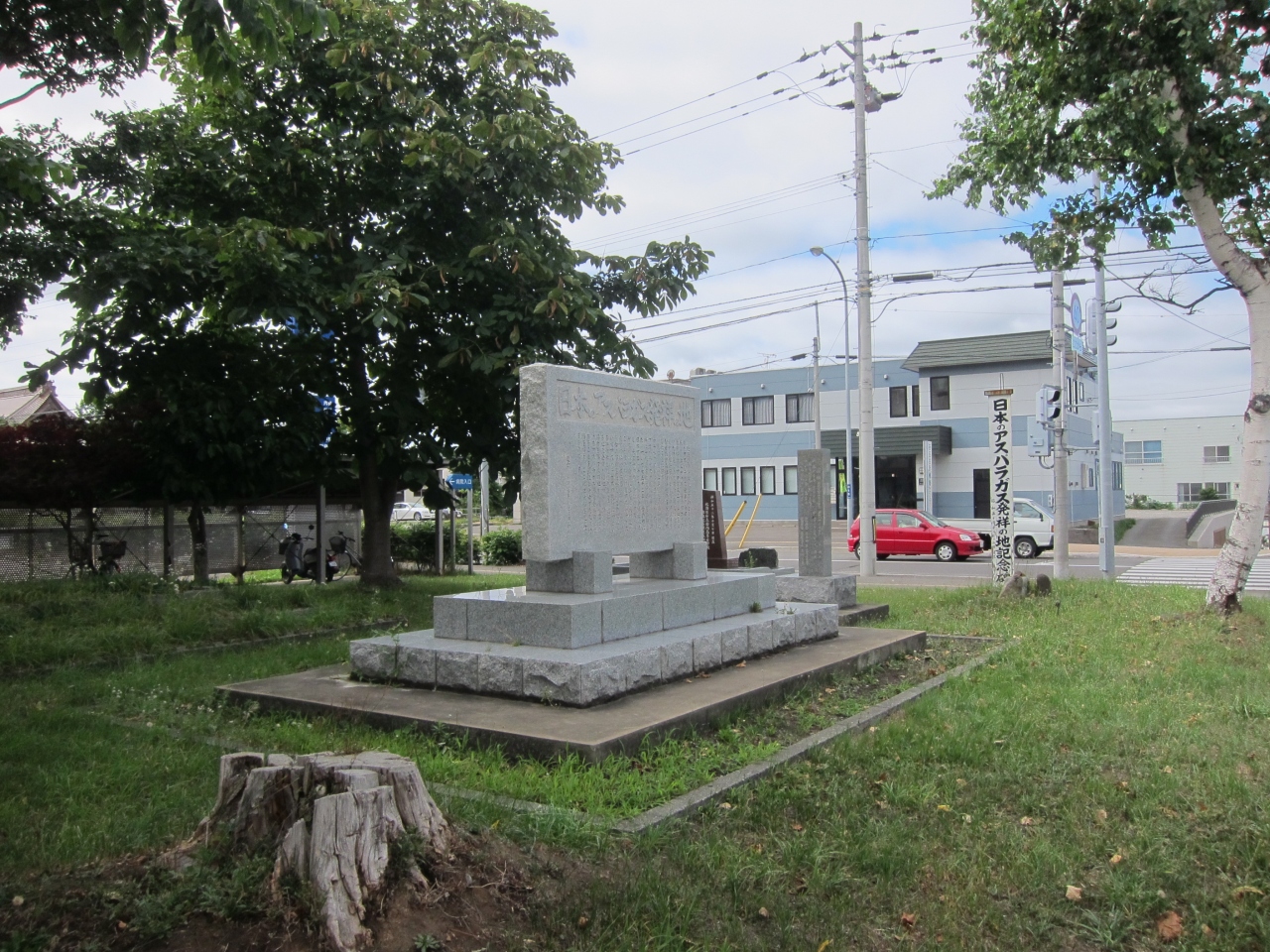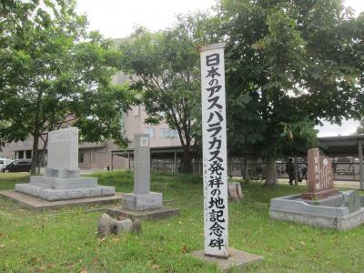 岩内のバスターミナル、道の駅から前の道を南(山)の方へ500mほど。岩内病院の一角にあります。ちょうど道道66号線の交差点の一角にあるので目立ちますが、あるのは石碑と柱、ほかに学校跡の碑が立っています。大正時代の1922年、岩内町出身の下田博士がアスパラガスの新品種を開発し、日本で初めて本格的な生産を始め、1924年からは缶詰工場もここ岩内で稼動を始めたとのことです。海外へ輸出するほど品質が向上したとのことで、これらのことを記念して碑を建立したとのことです。街角にちょっと意外な建立物を偶然見つけました。