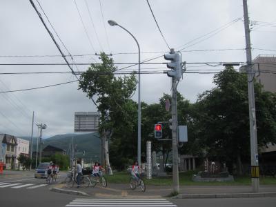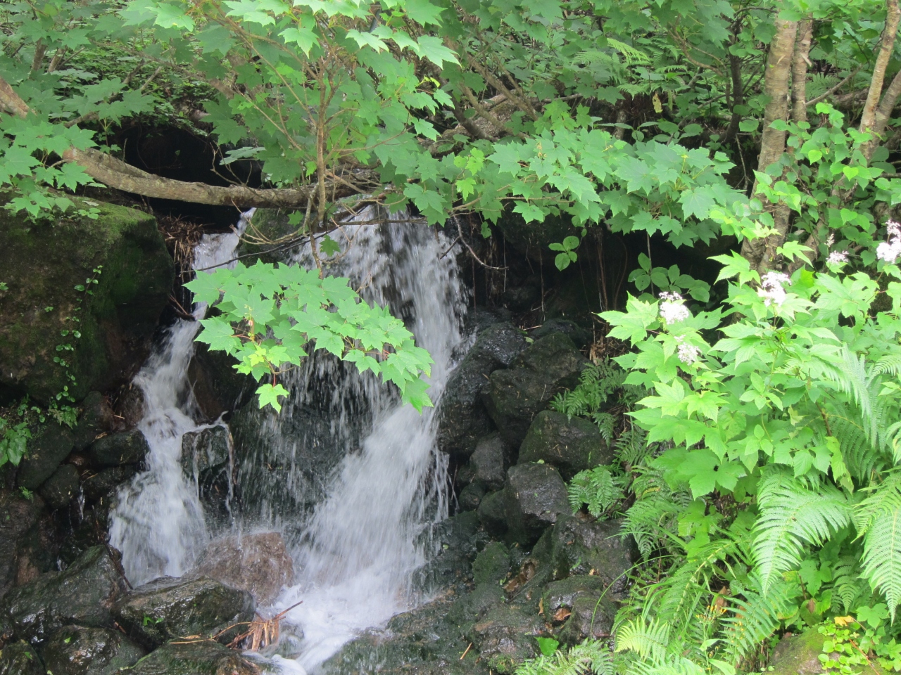 道道66号線のニセコ~岩内の区間で、急なカーブを交えニセコの山中に分け入り、標高800mほどの峠を越えて岩内・積丹の海岸線、ニセコの盆地を時々見渡す風光明媚なルートです。連続するカーブがライダーなど走り屋さんにはたまらない、道内でも人気のルートの一つです。途中、神仙沼や分岐して少し離れたところに五色温泉があるなど、休憩や観光にちょうどよい場所もあります。今回は景色をゆっくり眺められるので、神仙沼から岩内に歩いて下りました。20km弱あるひたすら下りのルートです。天気が曇りがちだったのですが、共和町から岩内にかけての平野、そして岩内から積丹西側にかかる海岸線、泊原発などがときどき見えました。神仙沼を出てしばらく行くと新見温泉を経て蘭越へ抜ける道道268号線の分岐がありましたが、その後は山の中の一本道です。ときどきライダーの集団や車が通り過ぎていきます。自転車で上ってくる人もいました。歩きの利点は周囲の景色をじっくり眺めながらビューポイントでは立ち止まって好きなだけ眺められることです。車を路肩に寄せ、降りて眺めている人もいました。爽快なルートですが、道路脇に花が手向けてあったので、調子にのりすぎるのは禁物です。写真を撮ったりぼーっと眺めたり。とても癒される遊山の旅でした。