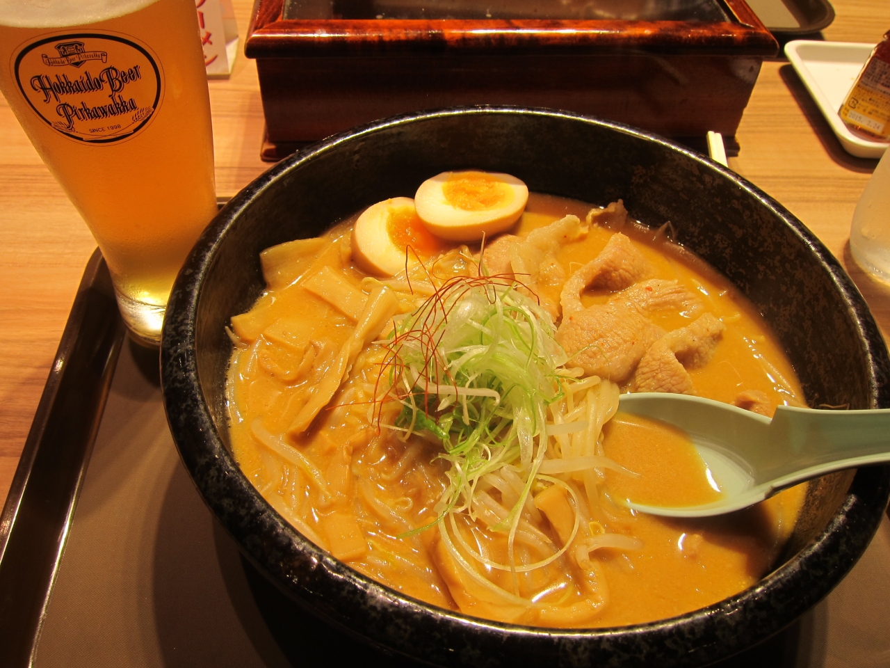 新千歳空港3階のグルメワールド内、北海道ラーメン道場の中にあります。ラーメン道場の表の各店のメニューを見て、こってりが効いていて辛味もある「トントロラーメン(みそ)」が気に入ったのでここに決めました。いつも混んでいますが、その日は休日の夜だったこともあり、並ばずに座れました。スープはもくろみどおり、辛味の効いたこってり!トントロは豚肉で脂身が疲れた体にぐっと効く感じです。もやしが良い感じでスープとトントロの脂とバランスをとってくれます。このメニューでは、注文の際、辛味増しかごはん付きかを選びますが、麺や脂身を味わってみたかったので、ごはんを選びました。こちらも一緒に頼んだギョーザと合わせておいしくいただけました。脂身のメニューに地元千歳の冷えた地ビールも付けて、お腹も心も満足の夕食となりました。
