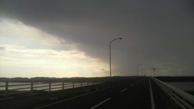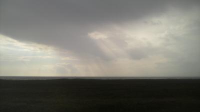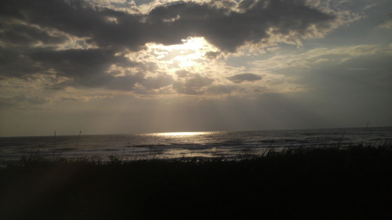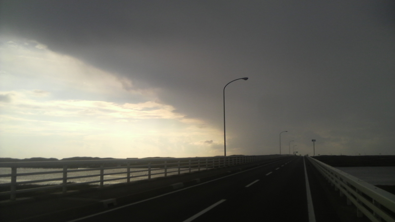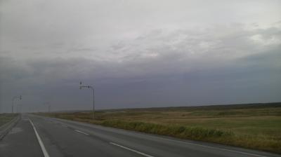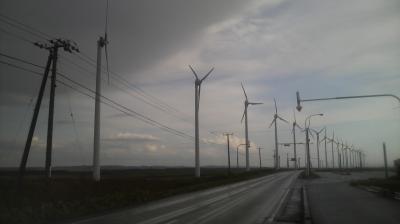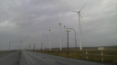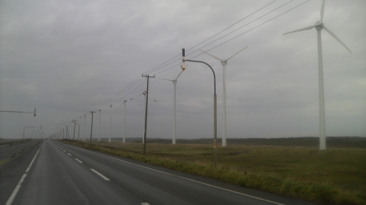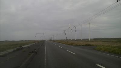 道内でもライダーや自転車の憧れのルートの一つ。条件の良いときには、道の反対側の洋上に利尻山が見え、広いサロベツ原野に白い風力発電用の風車が並び、まっすぐで見晴らしのよい道路を颯爽に駆け抜け…となるのですが、行ったときは残念ながら曇り空ににわか雨で利尻島も見えず、爽快に駆け抜けるという訳にはいきませんでした。風車の列は道沿いに数百mに及びます。道内でもこれだけ間近に眺められて、これだけの規模で風車が並ぶところはありません。付近は原野で一面、草や潅木が生い茂っていました。道路(道道106号線)は海岸砂丘の小高いところを通っているので見晴らしがよいです。人家も何もありませんが、道道106号線に対し、豊富駅方面に入っていく道道444号線との交差のあたりのレストハウス砂丘林や砂丘のえき辺りで店が開いていれば休憩がとれるほかは、豊富駅や道道972号線から幌延駅方面に入っていくか、道道106号線を天塩中心部まで戻るかしないといけません。