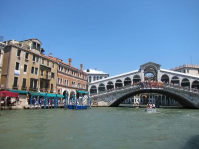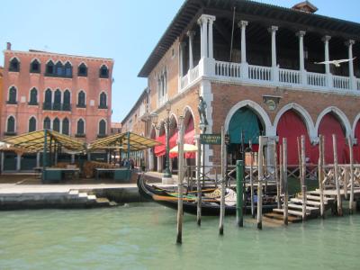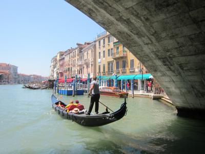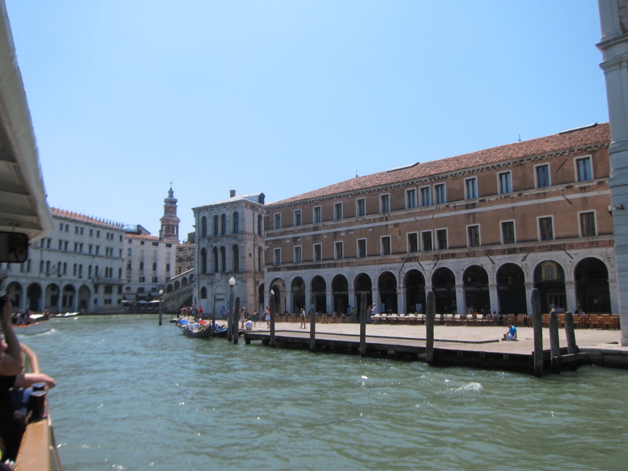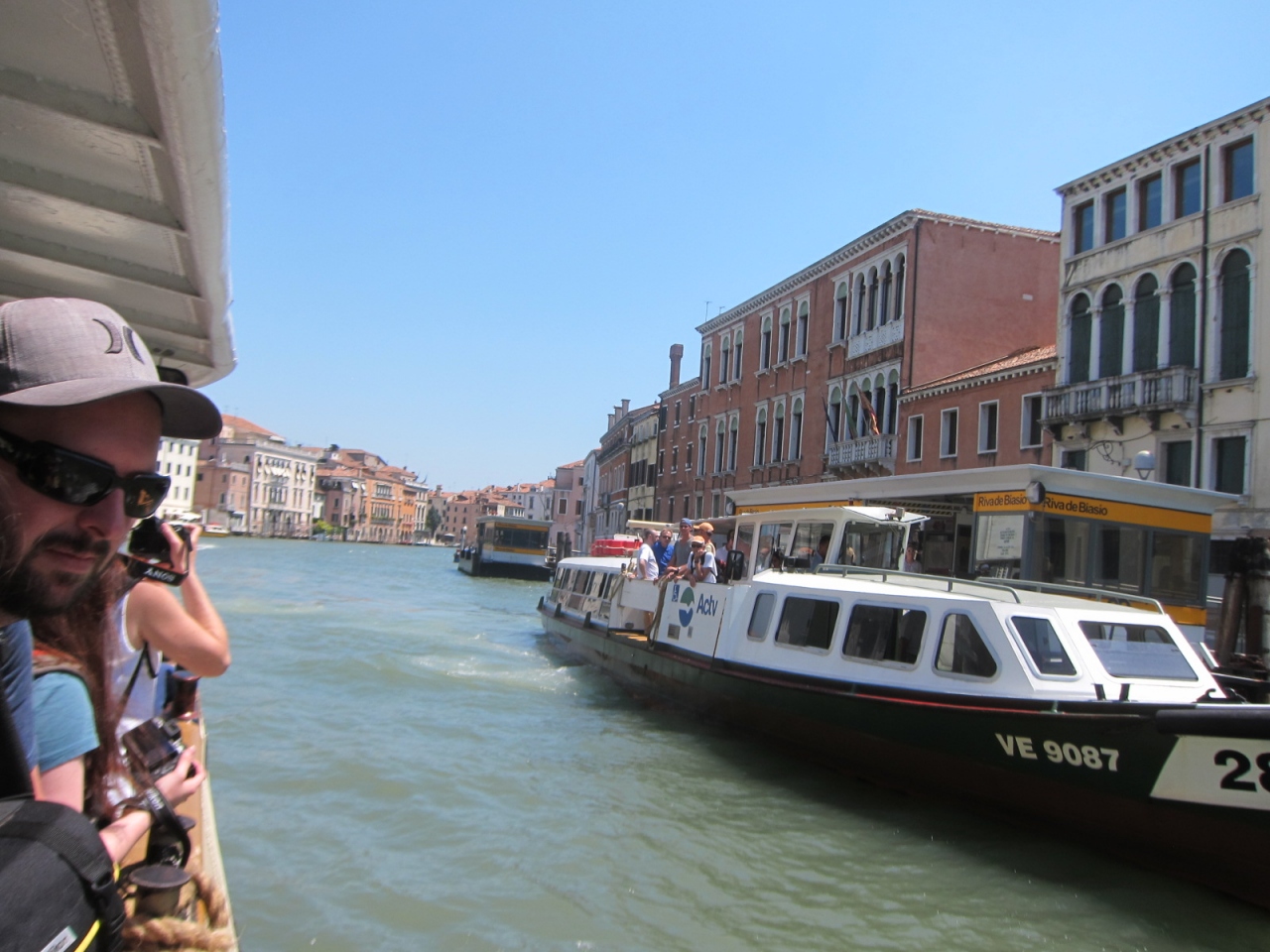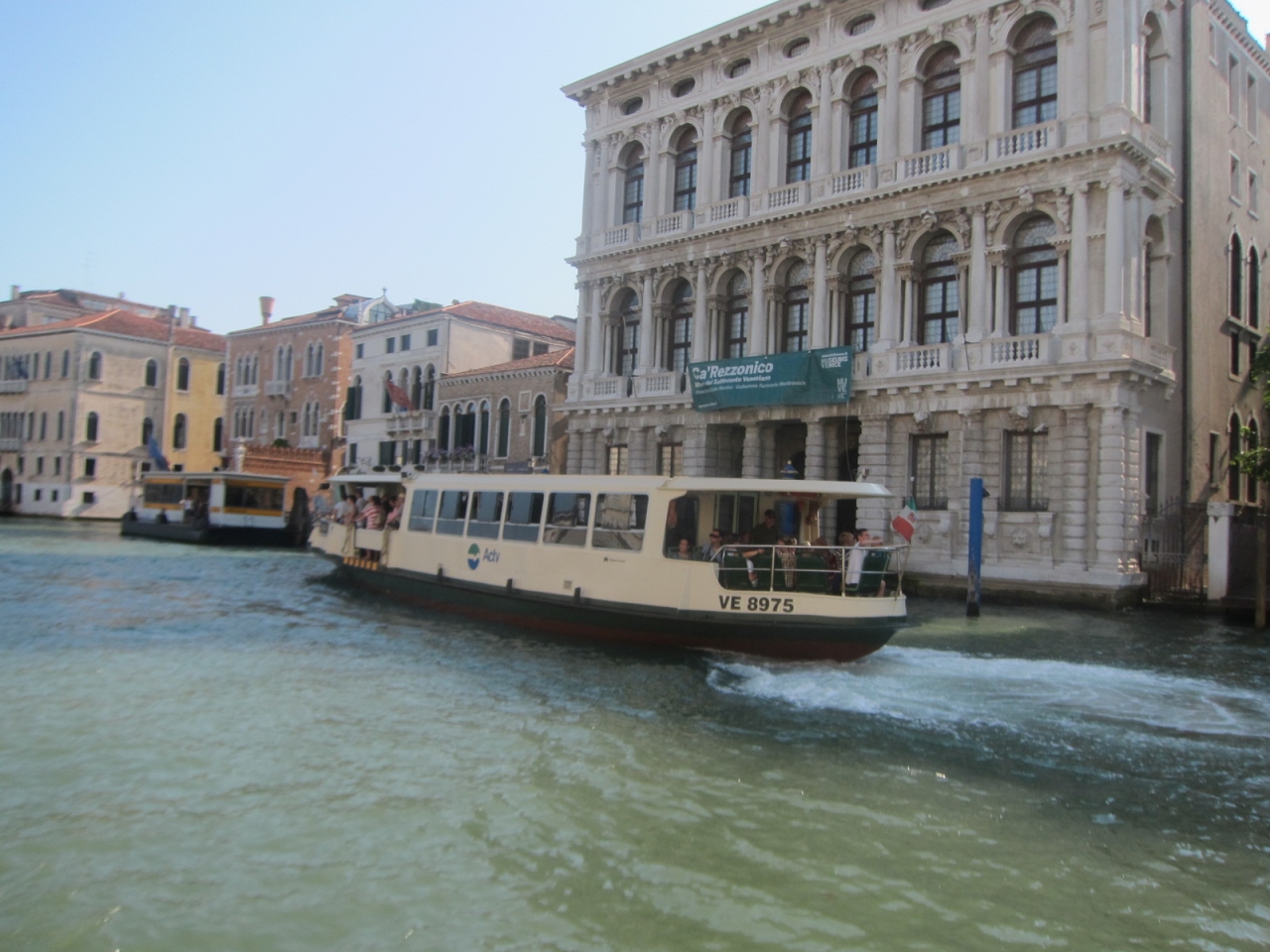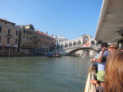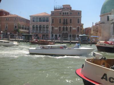行きかうゴンドラやプレジャーボート。7月の輝く日差しで汗ばむ暑さの中、水面を吹き渡る海風を顔に受けながら、水上バス、ヴァポレットで運河を移動しました。サンタ・ルチア駅の前からマルコ広場最寄りのGiardinettiまでです。駅を出ると目の前には早速カナル・グランデ。船着場を出た船はすぐにスカルツィ橋をくぐり、数々の商館を眺めながら時々船着場に寄って進んでいきました。10分くらいするとかの有名なリアルト橋をくぐります。船内には座席もありますが、次々に訪れるビューポイントに座っている暇はありません。甲板で涼風を顔一面に浴びながら30分あまりであっという間にマルコ広場近くまで着いてしまいました。ヴァポレットですが、1回券のほか、12時間券や24時間券等々があります。その都度列に並んで券を買うのもナンセンスなので自分の旅程に合ったものを選ぶとよいと思います。