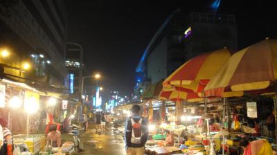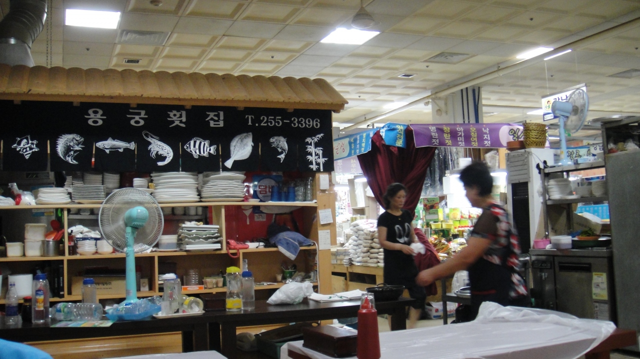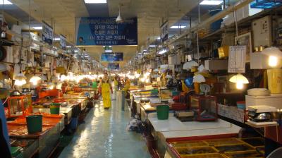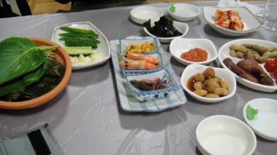夕食をここで食べました。地下鉄チャガルチ駅から4~5分。海の方に多少歩いたところにあります。露店もありましたが、夜だったのでチャガルチ市場ビルに入りました。1階はたくさんの水槽が並び、魚が売られていました。2階に上がるといくつかの店が入った食堂になっており、皆、座敷で和気藹々と食事をしていました。つうの人なら1階で好きな魚を買ってここで料理してもらうのでしょうが、とにかく座敷に座ってお任せで料理を頼みました。日本語のできる人もいて、店主という方が挨拶に来てくれました。料理は海の幸に、野菜をふんだんに使う料理が多かったです。店のオモニさんが鍋の準備と食べ方を教えてくれました。
