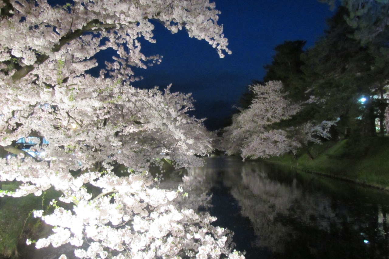 入城の際に必ず通りはしますが、外堀沿いの散策でお堀と桜の風景もなかなかきれいです。ちょっと離れていますが、お堀の北東角の津軽藩ねぷた村の辺りから、桜並木のお堀の先に岩木山がそびえている様子が、また絵になります。お堀の景色だけに、桜の散り始めの時期に訪れて花筏があった方が風情があると思います。ただ、散り始めると葉の緑が目立って汚れた感じに見えるので、夜桜で訪れると少しごまかせるのではないでしょうか。