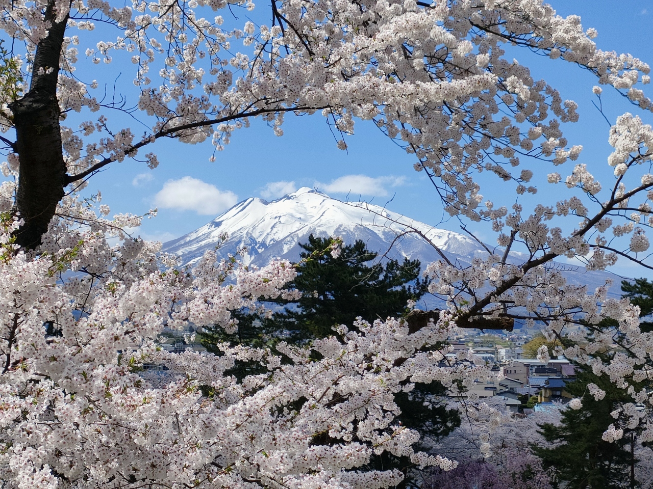 本丸の西側、西濠と蓮池に挟まれた土手道の「桜のトンネル」の途中からも岩木山が見えます。本丸より低い位置からの岩木山で、桜の背後には住宅地も見えますが、青い西濠とピンクの桜の背後に頭を出した岩木山が見えます。