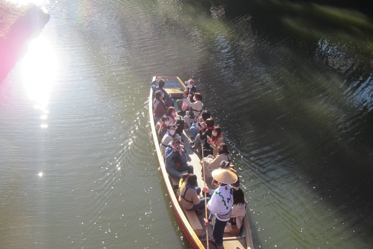 船頭さんが竹竿で漕いでくれる船で、スーッと水面を進む感覚も面白く感じ、同じくお城の反対側の西濠で行われている貸しボートよりも、自分で漕がなくて良い分、断然楽です。ただし、景色は西濠ほど桜は多くなく、普段眺められないアングルからの光景が楽しめるところが良いのかなと思いました。船は、東内門の辺りから辰巳櫓を回って杉の大橋をくぐって未申櫓の手前で折り返しです。松江城のお堀の堀川めぐり(堀川遊覧船)よりも、距離・時間が短いのもちょっと残念なところですが、お堀が続いていないので仕方ありません。