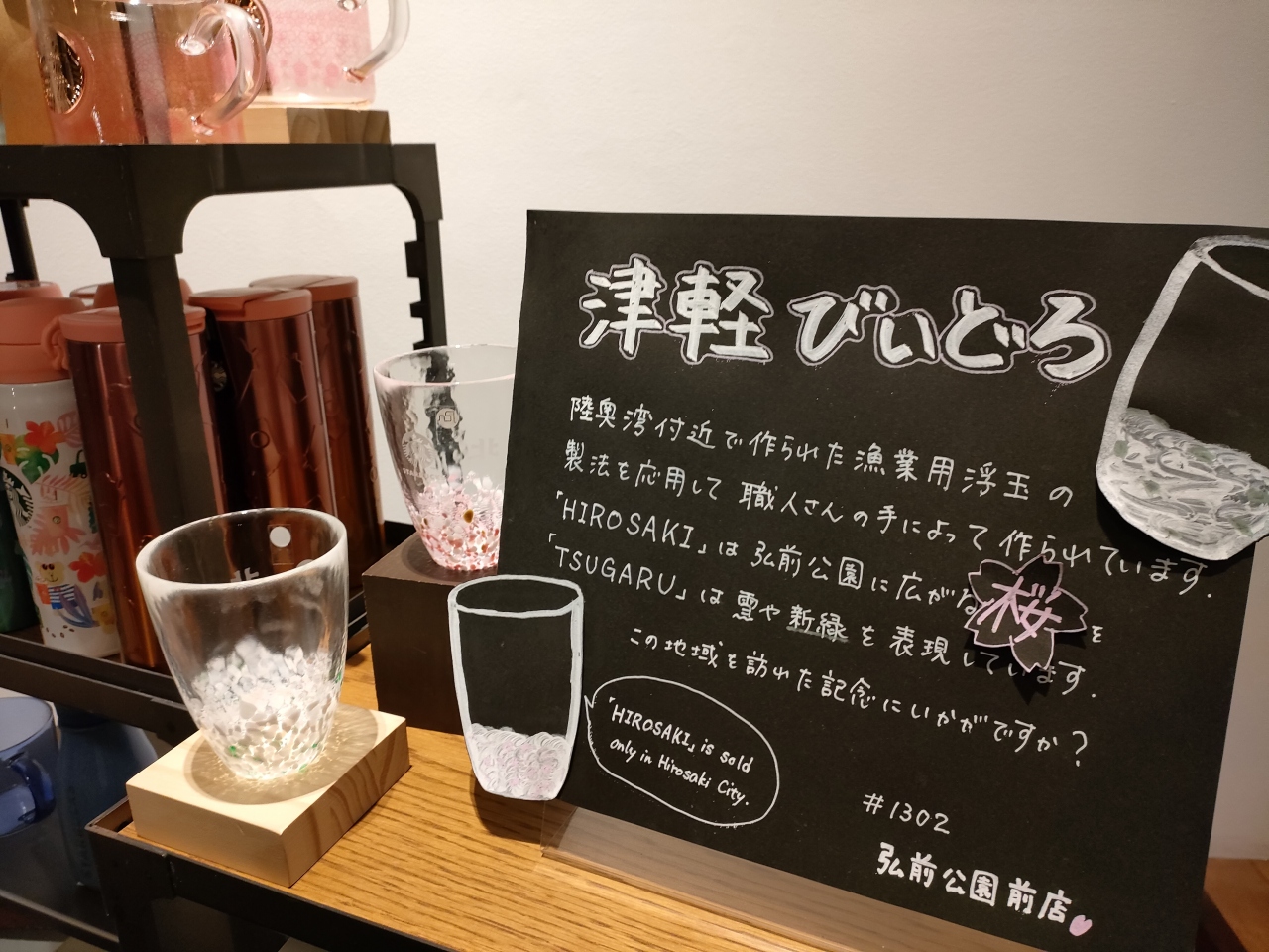青森県内のスタバなので、ヒロロ店でも桜柄の津軽びいどろのグラスを販売していましたが、\3,080円と、ちょっとお高めな値段でした。- 旅行時期
