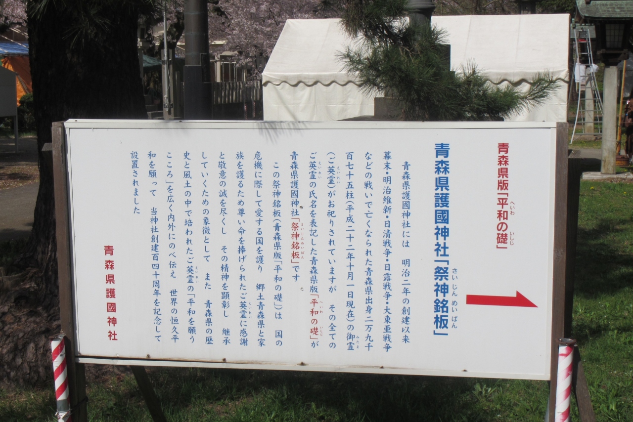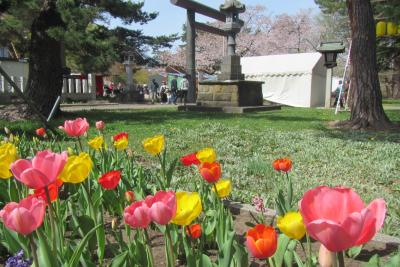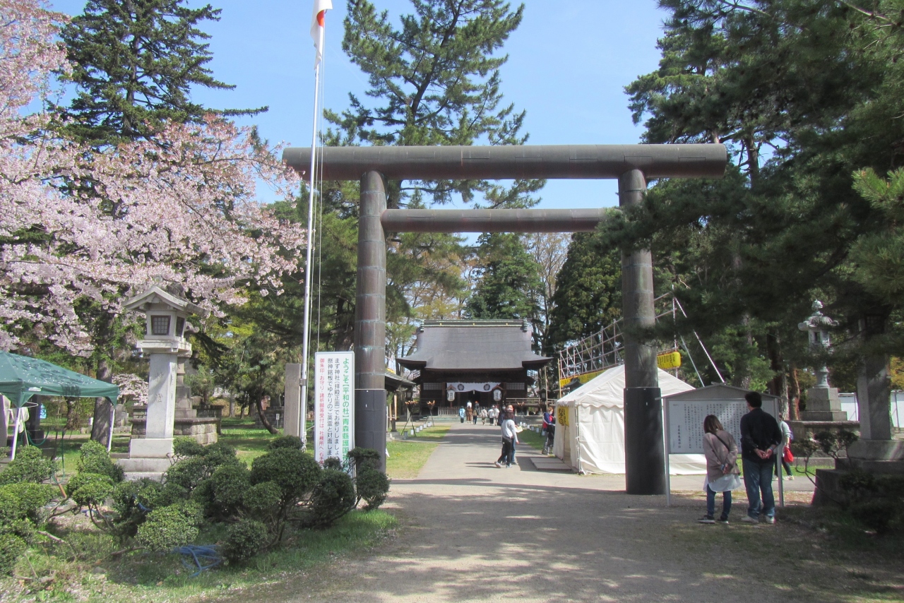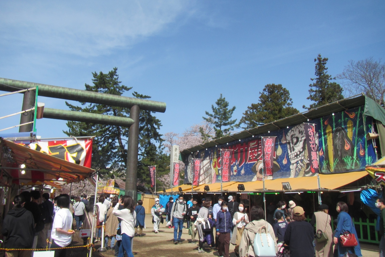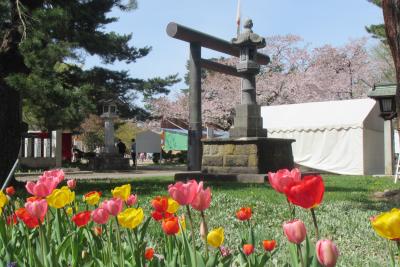 桜がきれいな弘前公園内(弘前城敷地内)のやや北側、四の丸にあり、弘前さくらまつり期間中に訪れたところ、弘前公園内の指定された飲食エリアとして、境内にたくさんの屋台が立ち並び、多くの人で賑わっていました。