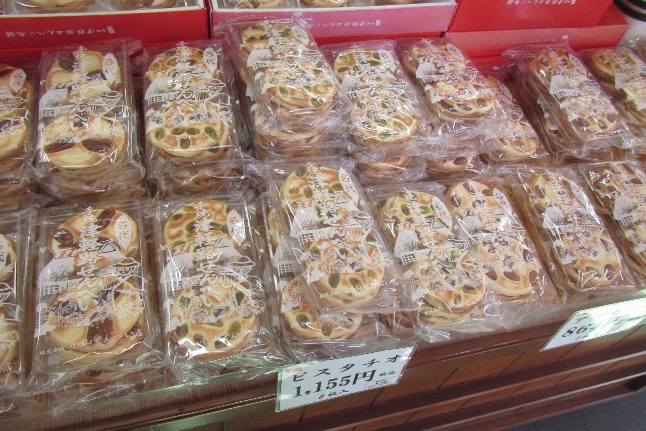 やはり、本店でも手焼き実演がなされていて、焼き立てが美味しそうでしたが、店頭販売されていたものは、あまり焼き上がりという感じではありませんでした。お豆がたくさん入ったお菓子のようなせんべいで、個人的には一番オーソドックスな”豆”(落花生)が一番美味しいと思いますが、ピスタチオも捨てがたいです。ピスタチオは他より¥200円ほど高い\1155円でした。