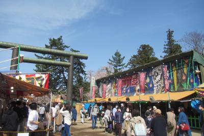 ただ、本殿手前の鳥居をくぐった本殿周辺になると人は少なめで、花壇のチューリップ・ヒヤシンスを楽しんだり、社務所建物の前の特設テントでお守りなどの授与品を眺めたりしました。