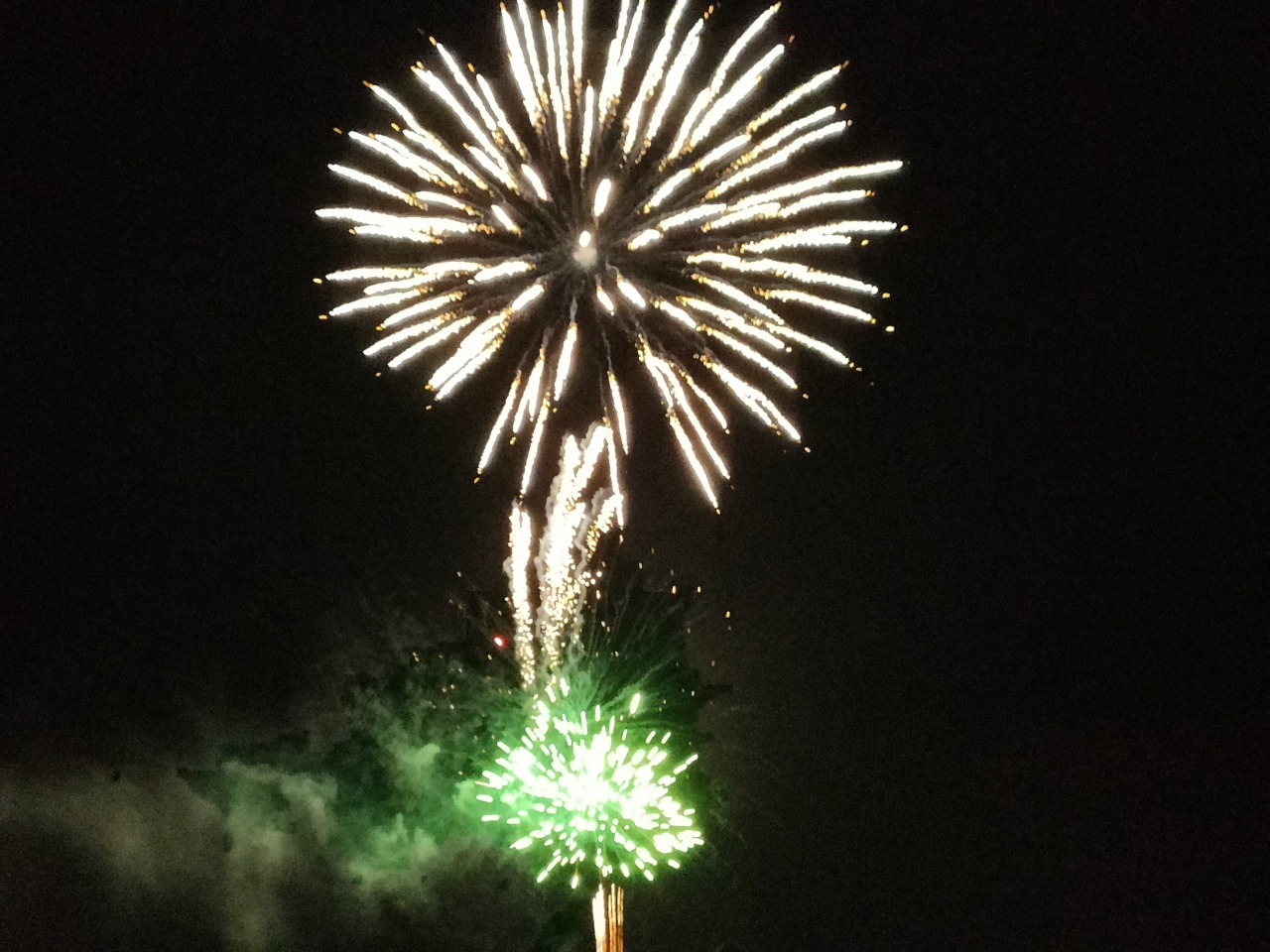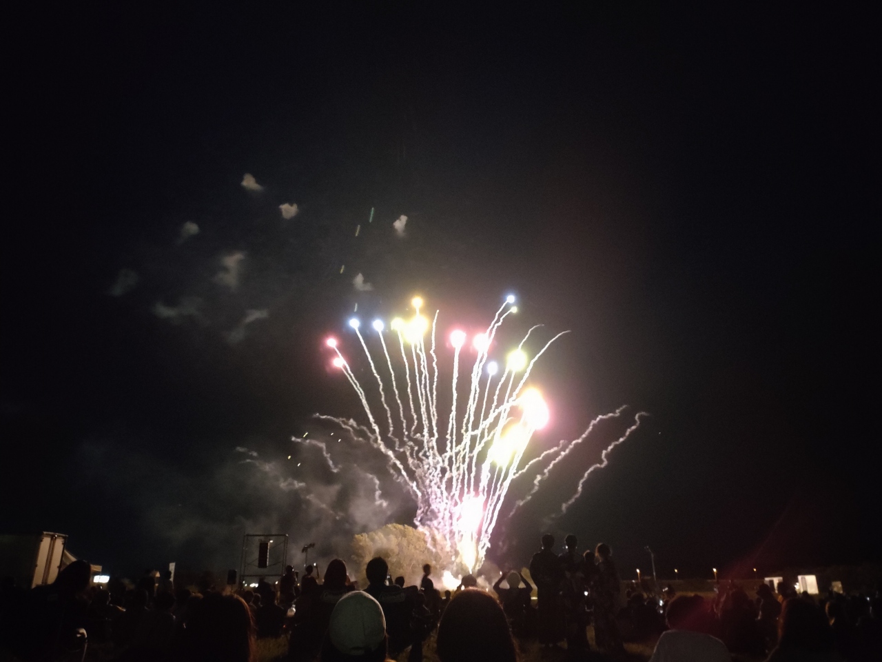 打ち上げ場所に近いところでは、火の粉が落ちてくるのではないかしらと思えるほど直上に近い角度に上がります。観覧場所は当別神社がある阿蘇公園で、神社参道からそれて奥に入った少年野球場の草原で観ました。